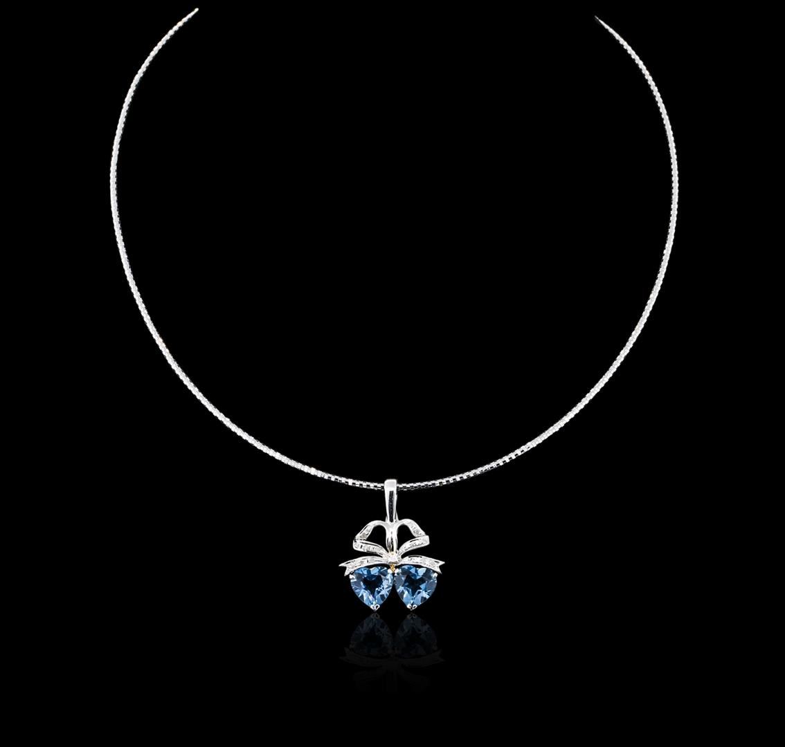 One necklace featuring: 14KT white gold weighing 10.90 grams containing prong set twin heart shape blue topaz main stones with a total weight of 6.00cts and round cut diamonds with a total weight of 0.10cts.
