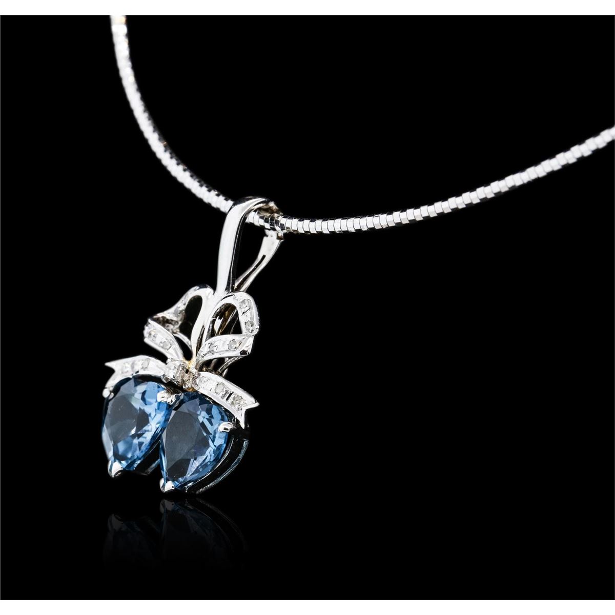 One necklace featuring: 14KT white gold weighing 10.90 grams containing prong set twin heart shape blue topaz main stones with a total weight of 6.00cts and round cut diamonds with a total weight of 0.10cts.
