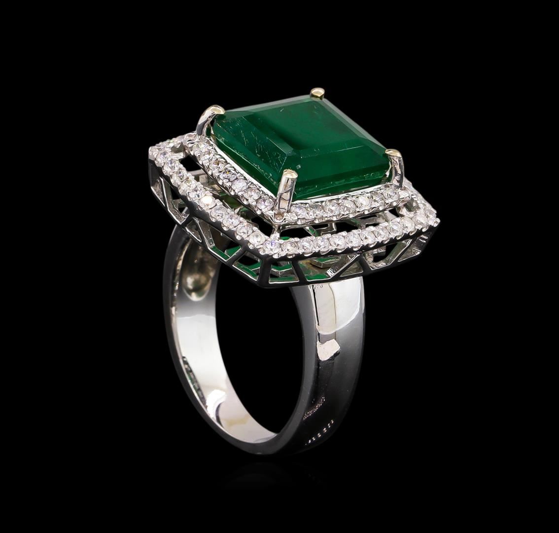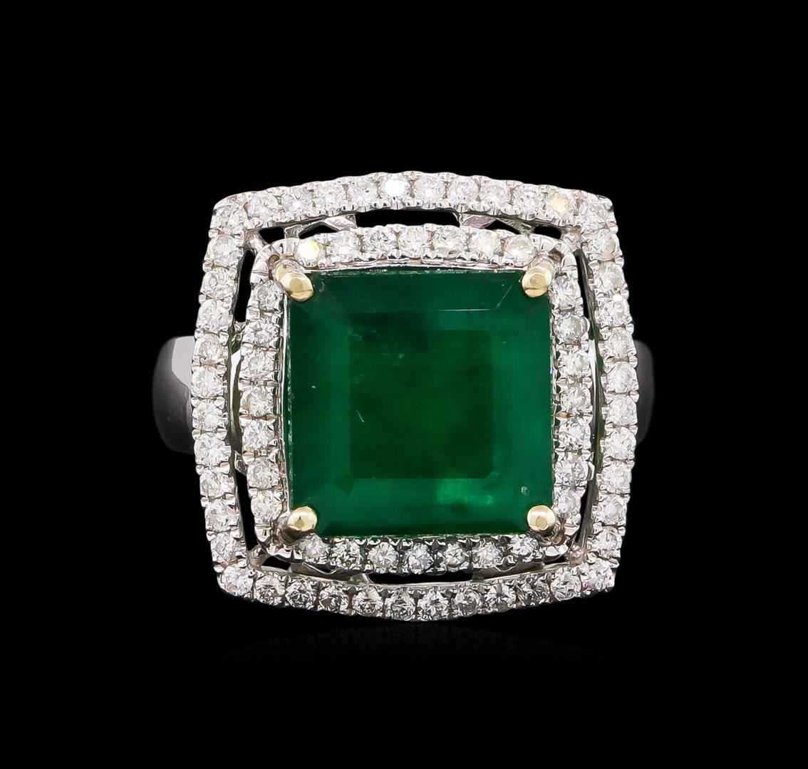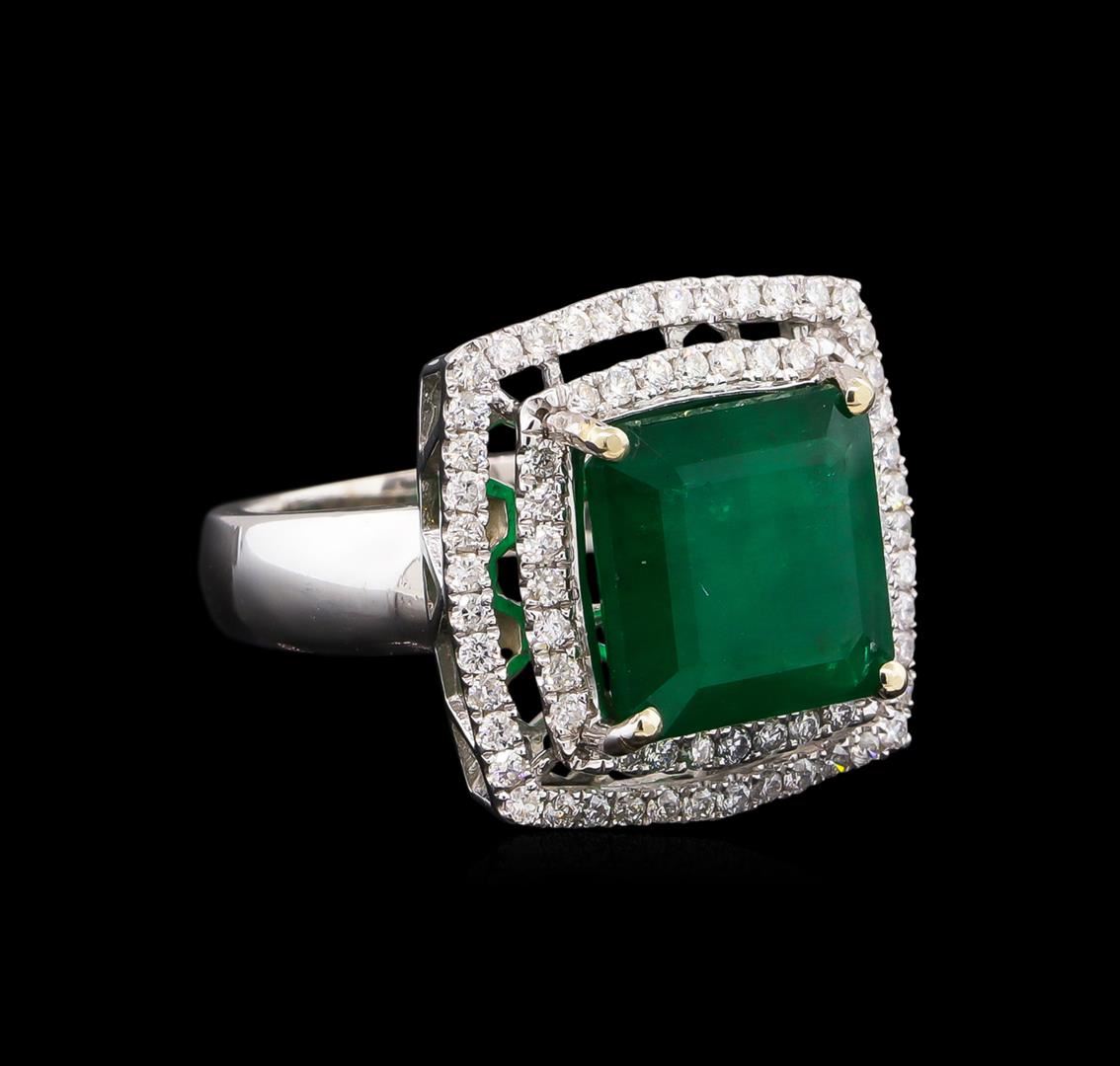 One electronically tested 14KT white gold Ladies combination cast & assembled ring with a bright polish finish. Condition is new. Containing: One prong set emerald standard step cut natural emerald, measuring 11.10 x 11.10 x 6.66mm, approximate weight of 6.03ct., clarity is heavily included, type III, medium, moderately strong, green color, (GIA G 5/4), cut is good. Colored gemstones are presumed to have been subjected to commonly used color/clarity enhancement processes. Seventy-Two prong set round brilliant cut diamonds, measuring 1.30 - 1.30 x 0.78mm (depth est.) approximate. Total Weight of 72 Stones = 0.58ct. Clarity: I-1 to I-2. Color: I - J, Cut is Good. Total Weight of Colored Stones 6.03ct. Total Weight of Diamonds 0.58ct. Total Weight of Ring 9.40 grams. GGL Appraised at $10,030.00.