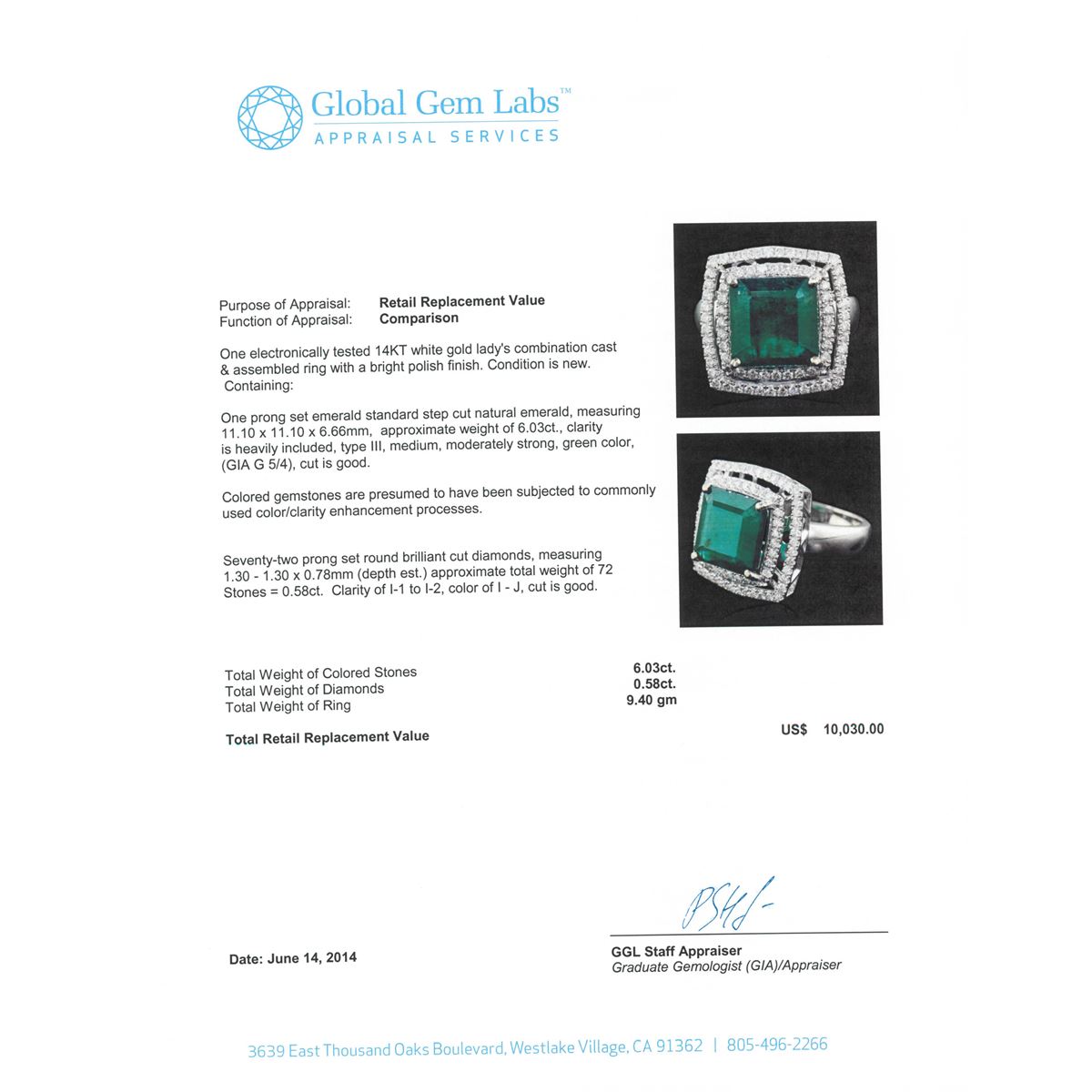 One electronically tested 14KT white gold Ladies combination cast & assembled ring with a bright polish finish. Condition is new. Containing: One prong set emerald standard step cut natural emerald, measuring 11.10 x 11.10 x 6.66mm, approximate weight of 6.03ct., clarity is heavily included, type III, medium, moderately strong, green color, (GIA G 5/4), cut is good. Colored gemstones are presumed to have been subjected to commonly used color/clarity enhancement processes. Seventy-Two prong set round brilliant cut diamonds, measuring 1.30 - 1.30 x 0.78mm (depth est.) approximate. Total Weight of 72 Stones = 0.58ct. Clarity: I-1 to I-2. Color: I - J, Cut is Good. Total Weight of Colored Stones 6.03ct. Total Weight of Diamonds 0.58ct. Total Weight of Ring 9.40 grams. GGL Appraised at $10,030.00.