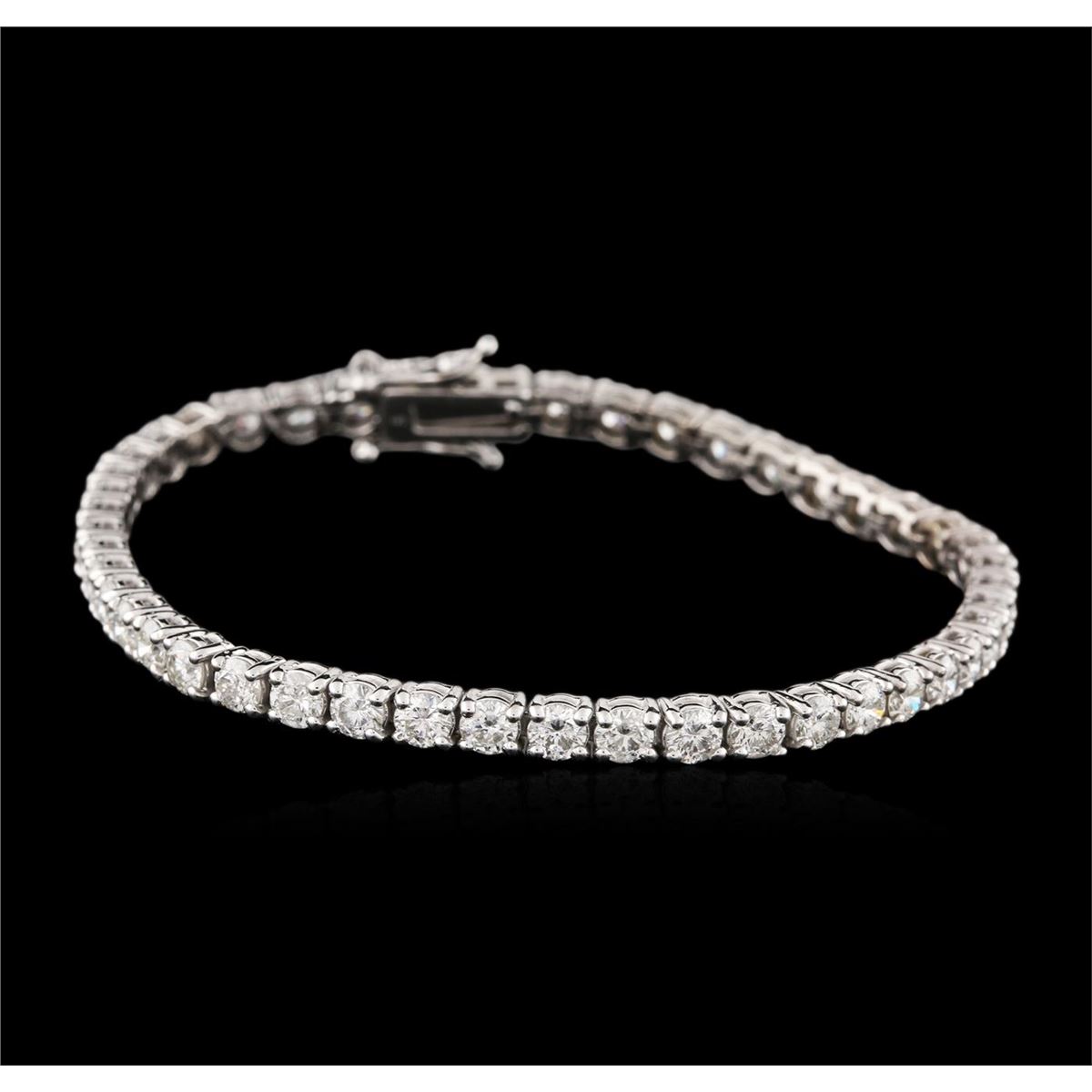 One electronically tested 14KT white gold ladies cast diamond tennis bracelet with a hidden box clasp with a bright and brushed finish. Measurements: 7." in length. Identified with markings of "14K". Condition is new. Containing: Forty-Six prong set round brilliant cut diamonds, measuring 3.30 - 3.30 x 1.98mm (depth est.) approximate total weight of 46 Stones = 6.05ct. Clarity: I-1 to I-2. Color: I - K. All diamonds are graded in the mounting, unless otherwise stated. Total Weight of Diamonds 6.05ct. Total Weight of Tennis Bracelet 10.80 grams. GGL Appraised at $11,325.00.