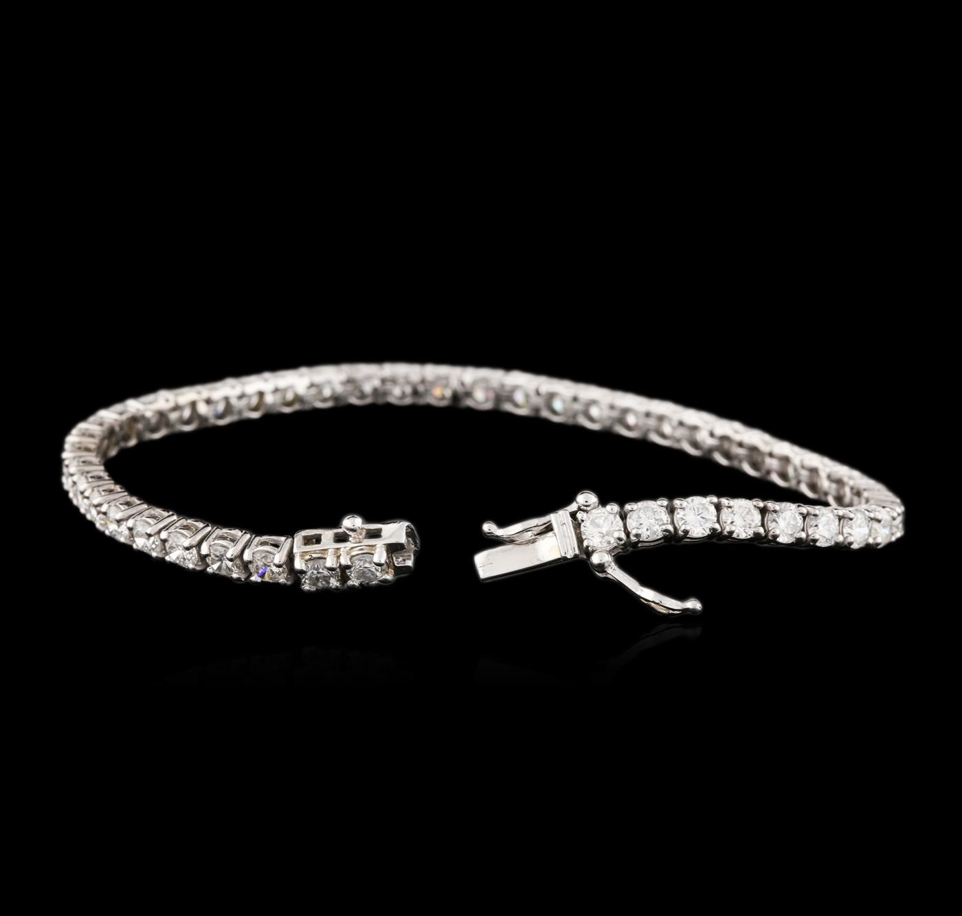 One electronically tested 14KT white gold ladies cast diamond tennis bracelet with a hidden box clasp with a bright and brushed finish. Measurements: 7." in length. Identified with markings of "14K". Condition is new. Containing: Forty-Six prong set round brilliant cut diamonds, measuring 3.30 - 3.30 x 1.98mm (depth est.) approximate total weight of 46 Stones = 6.05ct. Clarity: I-1 to I-2. Color: I - K. All diamonds are graded in the mounting, unless otherwise stated. Total Weight of Diamonds 6.05ct. Total Weight of Tennis Bracelet 10.80 grams. GGL Appraised at $11,325.00.