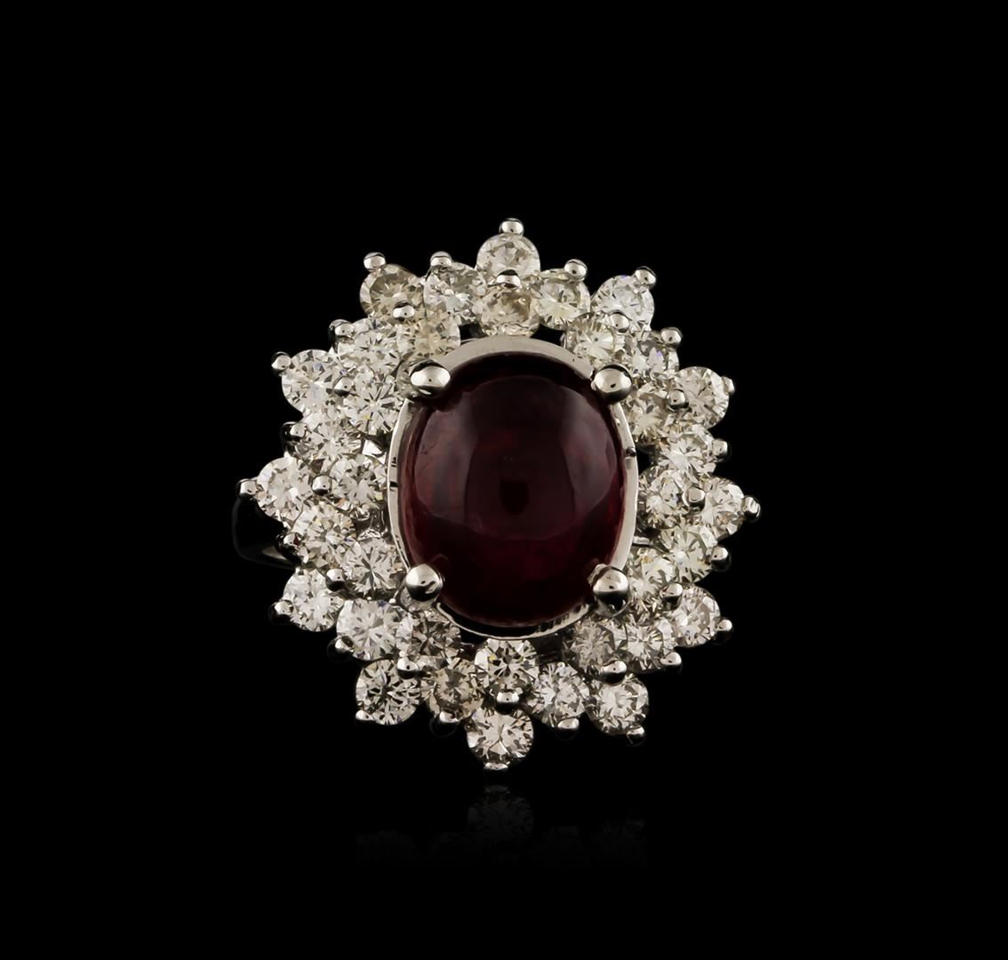 One electronically tested 14KT white gold ladies cast ruby and diamond ring with a bright polish finish. Identified with markings of "14K". Condition is new. Containing: One prong set oval cabochon cut natural ruby, measuring 11.40 x 9.40 x 5.23mm, approximate weight of 6.05ct., clarity is heavily included, type II, medium dark, moderately strong, strongly purplish red color, (GIA stpR 6/4), cut is good. Thirty-Six prong set round brilliant cut diamonds, measuring 2.60 - 2.50 x 1.53mm (depth est.) approximate total weight of 36 Stones = 2.18ct. Clarity: SI-1 to SI-2. Color: J - K, Cut is Good. Colored gemstones are presumed to have been subjected to commonly used enhancement processes, All diamonds and colored gemstones are graded in the mounting, unless otherwise stated. Total Weight of Colored Stones 6.05ct. Total Weight of Diamonds 2.18ct. Total Weight of Ring 8.80 grams. GGL Appraised at $6,880.00.