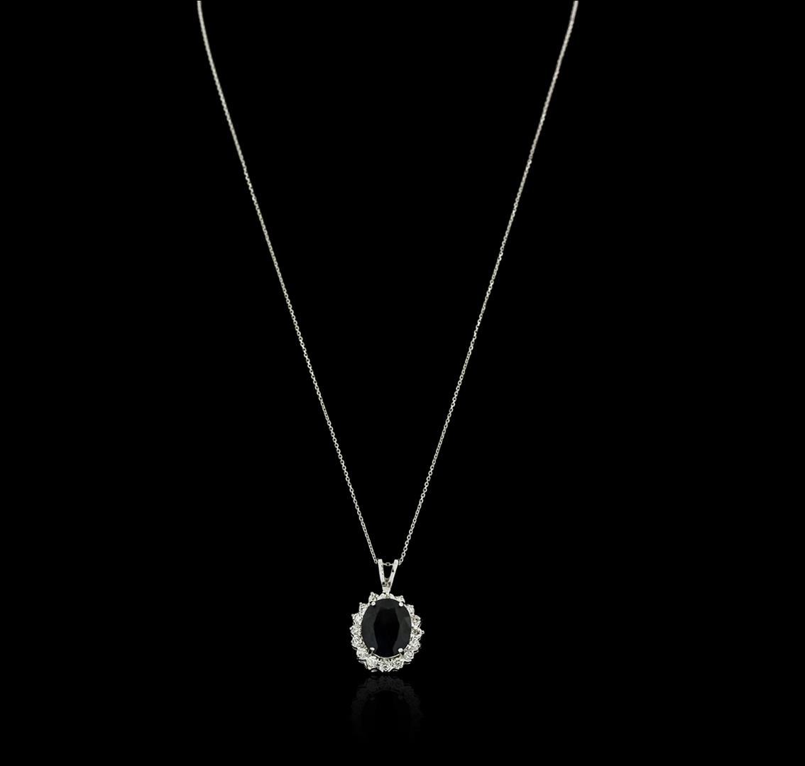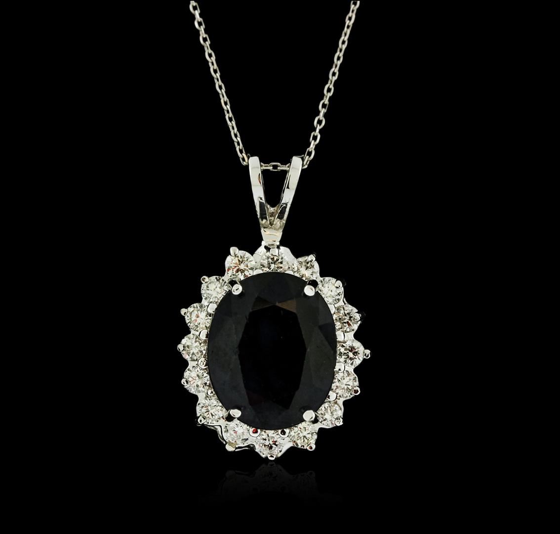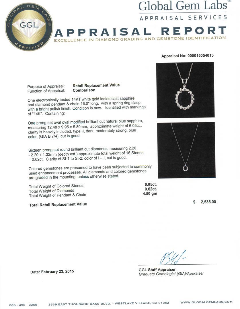 One electronically tested 14KT white gold ladies cast sapphire and diamond pendant & chain 16.0" long, with a spring ring clasp with a bright polish finish. Identified with markings of "14K". Condition is new. Containing: One prong set oval oval modified brilliant cut natural blue sapphire, measuring 12.48 x 9.95 x 5.80mm, approximate weight of 6.05ct., clarity is heavily included, type II, dark, moderately strong, blue color, (GIA B 7/4), cut is good. Sixteen prong set round brilliant cut diamonds, measuring 2.20 - 2.20 x 1.32mm (depth est.) approximate total weight of 16 Stones = 0.62ct. Clarity: SI-1 to SI-2. Color: I - J, Cut is Good. Colored gemstones are presumed to have been subjected to commonly used enhancement processes. All diamonds and colored gemstones are graded in the mounting, unless otherwise stated. Total Weight of Colored Stones 6.05ct. Total Weight of Diamonds 0.62ct. Total Weight of Pendant & Chain 4.50 grams. GGL Appraised at $2,535.00.