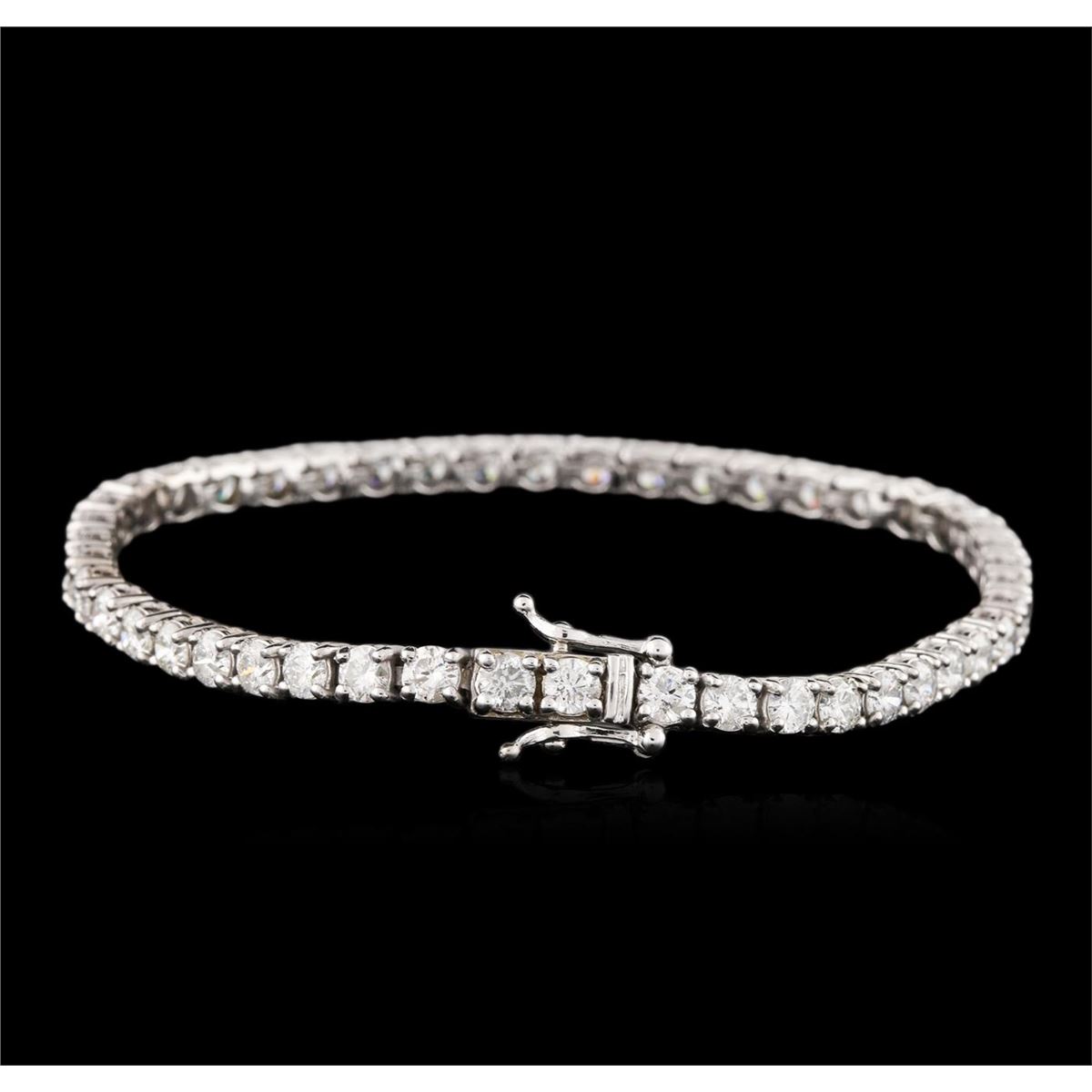 One electronically tested 14KT white gold ladies cast diamond tennis bracelet with a hidden box clasp with a bright and brushed finish. Measurements: 7." in length. Identified with markings of "14K". Condition is new. Containing: Forty-Six prong set round brilliant cut diamonds, measuring 3.30 - 3.30 x 1.98mm (depth est.) approximate total weight of 46 Stones = 6.05ct. Clarity: I-1 to I-2. Color: I - K. All diamonds are graded in the mounting, unless otherwise stated. Total Weight of Diamonds 6.05ct. Total Weight of Tennis Bracelet 10.80 grams. GGL Appraised at $11,325.00.