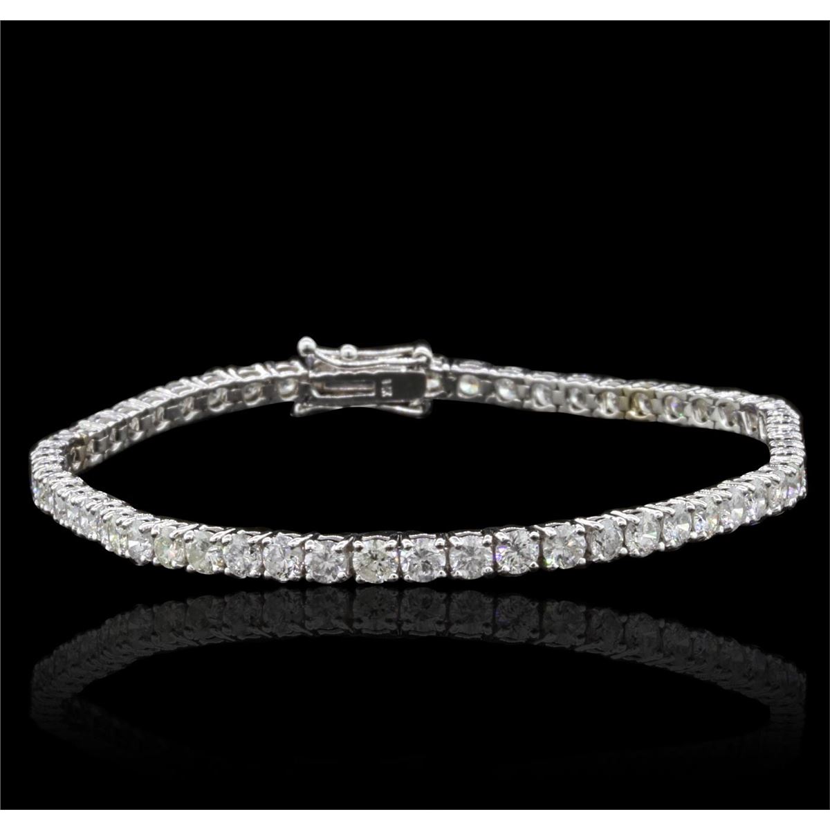 One electronically tested 14KT white gold ladies cast & assembled diamond tennis bracelet with a bright polish finish. Seven and one-half inch length bracelet composed of a flexible ribbon of diamonds, terminating in a concealed clasp with twin safeties. Identified with markings of "14KT". Condition is new, good workmanship. Tennis bracelets & necklaces got their unusual name from an incident involving the U.S. professional tennis player Chris Evert during a tennis match in the 1980's. Evert had been wearing an expensive diamond bracelet, an inline string of individually-set diamonds. Previously these bracelets were known as eternity bracelets. When the clasp snapped during play, she asked the officials to stop the tennis match until the bracelet could be found. Since that day, bracelets and necklaces featuring an inline string of diamonds have been called tennis bracelets and tennis necklaces. Containing: Fifty-Eight prong set round brilliant cut diamonds, measuring 3.10 - 3.00 x 1.83mm (depth est.) approximate. Total Weight of 58 Stones = 6.12ct. Graded in the setting. Clarity: I-1 to I-2. Color: H - J. Total Weight of Diamonds 6.12ct. Total Weight of Tennis Bracelet 8.36 grams. AIG Appraised at $14,350.00.
