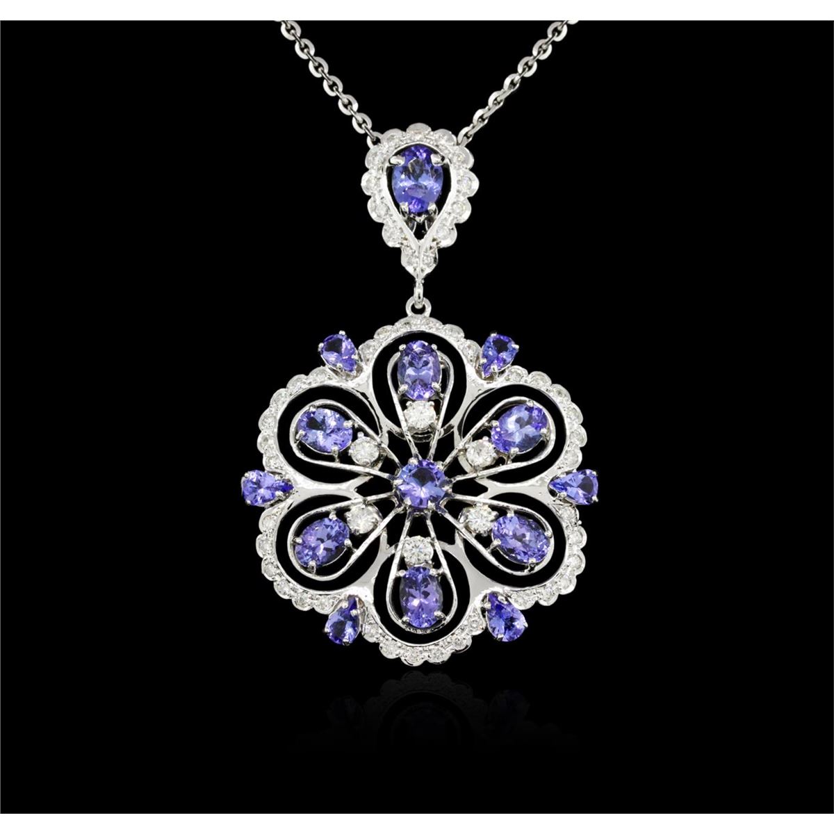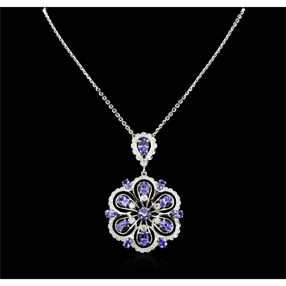 One electronically tested 14KT white gold ladies combination cast & assembled tanzanite and diamond pendant & chain 18.0" long, cable link with a lobster claw clasp with a bright polish finish. Identified with markings of "14K". Condition is new. Containing: Six prong set pear modified brilliant cut natural tanzanites, measuring 6.00 x 3.00 x 1.95mm, approximate total weight of 1.44ct., clarity is eye clean, type I, medium light, very slightly grayish, violet color, (GIA V 4/3), cut is good. One prong set oval modified brilliant cut natural tanzanite, measuring 8.00 x 6.00 x 3.90mm, approximate weight of 1.32ct., clarity is eye clean, type I, medium light, very slightly grayish, violet color, (GIA V 4/3), cut is good. Six prong set oval modified brilliant cut natural tanzanites, measuring 6.00 x 4.00 x 2.60mm, approximate total weight of 2.64ct., clarity is eye clean, type I, medium light, very slightly grayish, violet color, (GIA V 4/3), cut is good. One prong set round modified brilliant cut natural tanzanite, measuring 5.50 - 5.50 x 3.58 mm, approximate total weight of 0.73ct., clarity is eye clean, type I, medium light, very slightly grayish, violet color, (GIA V 4/3), cut is good. Fifty-Five prong set round brilliant cut diamonds, measuring 3.00 - 1.50 x 1.35mm (depth est.) approximate total weight of 55 Stones = 1.00ct. Clarity: SI-1 to I-1. Color: H - I. Colored gemstones are presumed to have been subjected to commonly used enhancement processes. All diamonds and colored gemstones are graded in the mounting, unless otherwise stated. Total Weight of Colored Stones 6.13ct. Total Weight of Diamonds 1.00ct. Total Weight of Pendant & Chain 21.30 grams. GGL Appraised at $7,630.00.