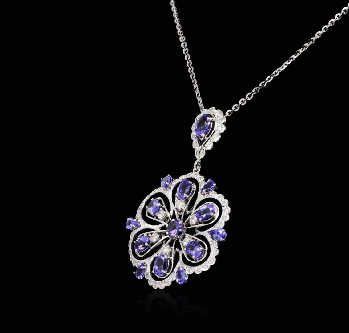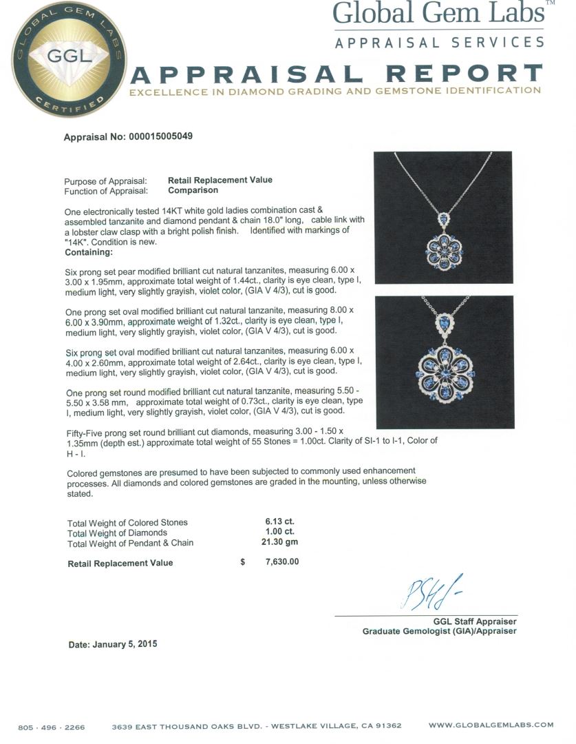 One electronically tested 14KT white gold ladies combination cast & assembled tanzanite and diamond pendant & chain 18.0" long, cable link with a lobster claw clasp with a bright polish finish. Identified with markings of "14K". Condition is new. Containing: Six prong set pear modified brilliant cut natural tanzanites, measuring 6.00 x 3.00 x 1.95mm, approximate total weight of 1.44ct., clarity is eye clean, type I, medium light, very slightly grayish, violet color, (GIA V 4/3), cut is good. One prong set oval modified brilliant cut natural tanzanite, measuring 8.00 x 6.00 x 3.90mm, approximate weight of 1.32ct., clarity is eye clean, type I, medium light, very slightly grayish, violet color, (GIA V 4/3), cut is good. Six prong set oval modified brilliant cut natural tanzanites, measuring 6.00 x 4.00 x 2.60mm, approximate total weight of 2.64ct., clarity is eye clean, type I, medium light, very slightly grayish, violet color, (GIA V 4/3), cut is good. One prong set round modified brilliant cut natural tanzanite, measuring 5.50 - 5.50 x 3.58 mm, approximate total weight of 0.73ct., clarity is eye clean, type I, medium light, very slightly grayish, violet color, (GIA V 4/3), cut is good. Fifty-Five prong set round brilliant cut diamonds, measuring 3.00 - 1.50 x 1.35mm (depth est.) approximate total weight of 55 Stones = 1.00ct. Clarity: SI-1 to I-1. Color: H - I. Colored gemstones are presumed to have been subjected to commonly used enhancement processes. All diamonds and colored gemstones are graded in the mounting, unless otherwise stated. Total Weight of Colored Stones 6.13ct. Total Weight of Diamonds 1.00ct. Total Weight of Pendant & Chain 21.30 grams. GGL Appraised at $7,630.00.