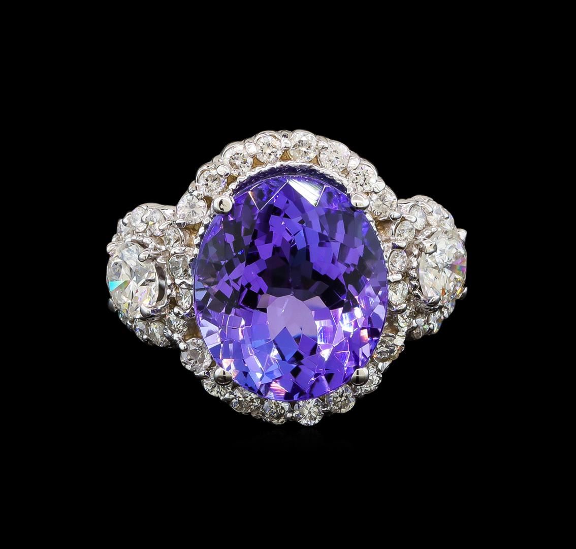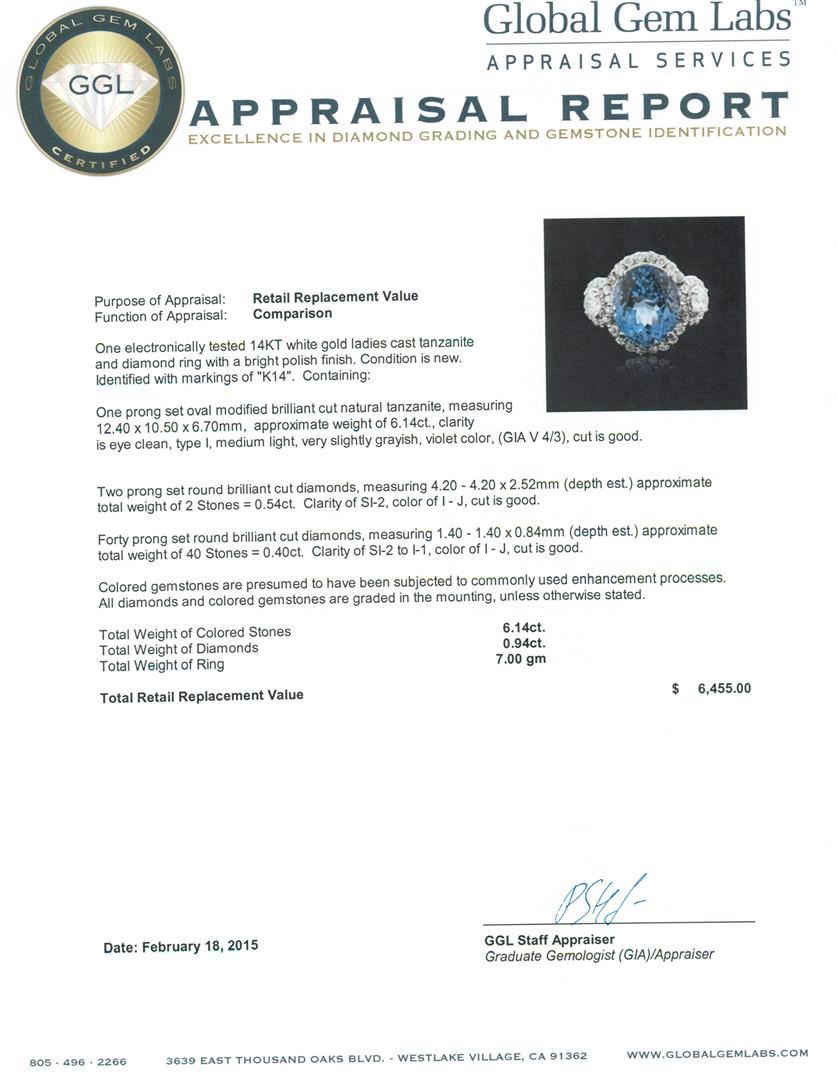 One electronically tested 14KT white gold ladies cast tanzanite and diamond ring with a bright polish finish. Identified with markings of "K14". Condition is new. Containing: One prong set oval modified brilliant cut natural tanzanite, measuring 12.40 x 10.50 x 6.70mm, approximate weight of 6.14ct., clarity is eye clean, type I, medium light, very slightly grayish, violet color, (GIA V 4/3), cut is good. Two prong set round brilliant cut diamonds, measuring 4.20 - 4.20 x 2.52mm (depth est.) approximate total weight of 2 Stones = 0.54ct. Clarity: SI-2. Color: I - J, Cut is Good. Forty prong set round brilliant cut diamonds, measuring 1.40 - 1.40 x 0.84mm (depth est.) approximate total weight of 40 Stones = 0.40ct. Clarity: SI-2 to I-1. Color: I - J, Cut is Good. Colored gemstones are presumed to have been subjected to commonly used enhancement processes. All diamonds and colored gemstones are graded in the mounting, unless otherwise stated. Total Weight of Colored Stones 6.14ct. Total Weight of Diamonds 0.94ct. Total Weight of Ring 7.00 grams. GGL Appraised at $6,455.00.