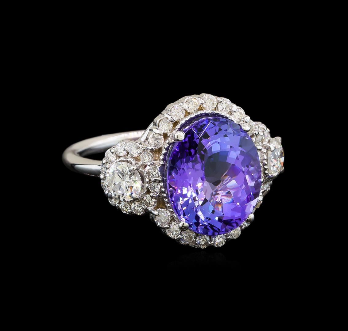 One electronically tested 14KT white gold ladies cast tanzanite and diamond ring with a bright polish finish. Identified with markings of "K14". Condition is new. Containing: One prong set oval modified brilliant cut natural tanzanite, measuring 12.40 x 10.50 x 6.70mm, approximate weight of 6.14ct., clarity is eye clean, type I, medium light, very slightly grayish, violet color, (GIA V 4/3), cut is good. Two prong set round brilliant cut diamonds, measuring 4.20 - 4.20 x 2.52mm (depth est.) approximate total weight of 2 Stones = 0.54ct. Clarity: SI-2. Color: I - J, Cut is Good. Forty prong set round brilliant cut diamonds, measuring 1.40 - 1.40 x 0.84mm (depth est.) approximate total weight of 40 Stones = 0.40ct. Clarity: SI-2 to I-1. Color: I - J, Cut is Good. Colored gemstones are presumed to have been subjected to commonly used enhancement processes. All diamonds and colored gemstones are graded in the mounting, unless otherwise stated. Total Weight of Colored Stones 6.14ct. Total Weight of Diamonds 0.94ct. Total Weight of Ring 7.00 grams. GGL Appraised at $6,455.00.