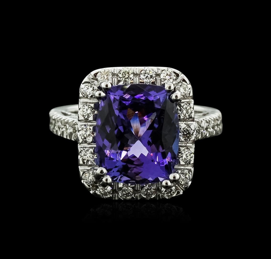 One electronically tested 14KT white gold ladies cast tanzanite and diamond ring with a bright polish finish. Identified with markings of "14K". Condition is new. Containing: One prong set rectangular cushion modified brilliant cut natural tanzanite, measuring 12.00 x 10.00 x 6.50mm, approximate weight of 6.14ct., clarity is eye clean, type I, medium, moderately strong, bluish violet color, (GIA bV 5/4), cut is good. Thirty prong set round brilliant cut diamonds, measuring 1.60 - 1.60 x 0.96mm (depth est.) approximate total weight of 30 Stones = 0.45ct. . Clarity: SI-1 to SI-2. Color: I - J, Cut is Good. Colored gemstones are presumed to have been subjected to commonly used enhancement processes. All diamonds and colored gemstones are graded in the mounting, unless otherwise stated.. Total Weight of Colored Stones 6.14ct.. Total Weight of Diamonds 0.45ct.. Total Weight of Ring 8.90 grams. GGL Appraised at $6,995.00.