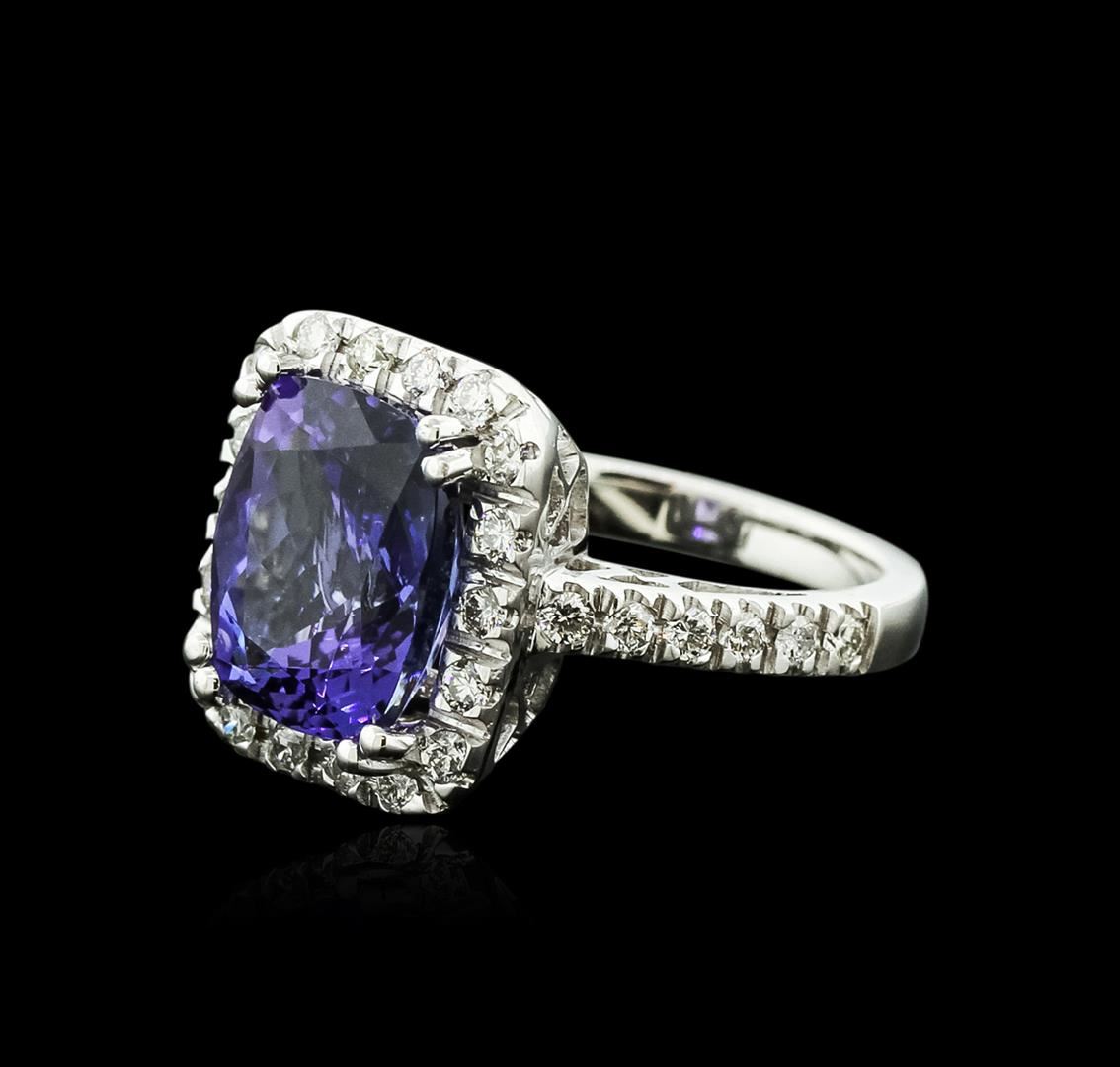 One electronically tested 14KT white gold ladies cast tanzanite and diamond ring with a bright polish finish. Identified with markings of "14K". Condition is new. Containing: One prong set rectangular cushion modified brilliant cut natural tanzanite, measuring 12.00 x 10.00 x 6.50mm, approximate weight of 6.14ct., clarity is eye clean, type I, medium, moderately strong, bluish violet color, (GIA bV 5/4), cut is good. Thirty prong set round brilliant cut diamonds, measuring 1.60 - 1.60 x 0.96mm (depth est.) approximate total weight of 30 Stones = 0.45ct. . Clarity: SI-1 to SI-2. Color: I - J, Cut is Good. Colored gemstones are presumed to have been subjected to commonly used enhancement processes. All diamonds and colored gemstones are graded in the mounting, unless otherwise stated.. Total Weight of Colored Stones 6.14ct.. Total Weight of Diamonds 0.45ct.. Total Weight of Ring 8.90 grams. GGL Appraised.