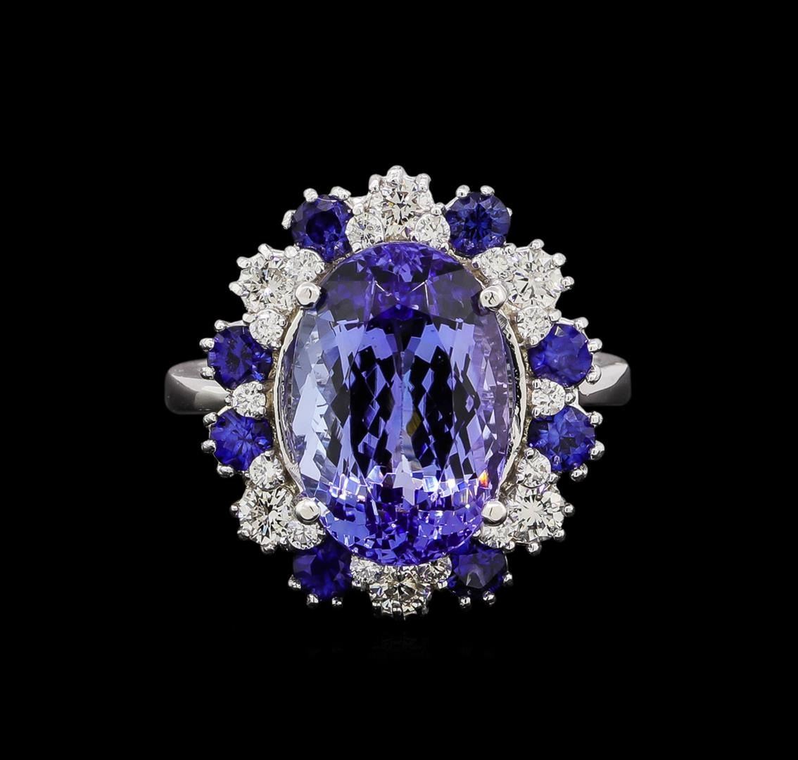 One electronically tested 14KT white gold ladies cast tanzanite, sapphire and diamond ring with a bright polish finish. Identified with markings of "14K". Condition is new. Containing: One prong set oval modified brilliant cut natural tanzanite, measuring 13.60 x 9.10 x 7.20mm, approximate weight of 6.27ct., clarity is eye clean, type I, medium light, slightly grayish, violet color, (GIA V 4/2), cut is good. Eight prong set round modified brilliant cut natural blue sapphires, measuring 2.60 - 2.60 x 1.69 mm, approximate total weight of 0.72ct., clarity is slightly included, type II, medium, moderately strong, blue color, (GIA B 5/4), cut is good. Six prong set round brilliant cut diamonds, measuring 2.50 - 2.50 x 1.50mm (depth est.) approximate total weight of 6 Stones = 0.34ct. Clarity: SI-1 to SI-2. Color: I - J, Cut is Good. Fourteen prong set round brilliant cut diamonds, measuring 1.30 - 1.30 x 0.78mm (depth est.) approximate total weight of 14 Stones = 0.11ct. Clarity: SI-1 to SI-2. Color: I - J, Cut is Good. Colored gemstones are presumed to have been subjected to commonly used enhancement processes. All diamonds and colored gemstones are graded in the mounting, unless otherwise stated. Total Weight of Colored Stones 6.99ct. Total Weight of Diamonds 0.46ct. Total Weight of Ring 6.30 grams. GGL Appraised.