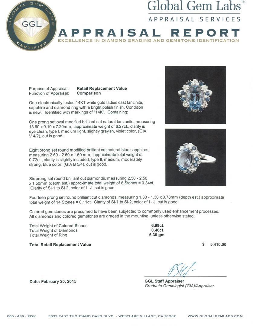 One electronically tested 14KT white gold ladies cast tanzanite, sapphire and diamond ring with a bright polish finish. Identified with markings of "14K". Condition is new. Containing: One prong set oval modified brilliant cut natural tanzanite, measuring 13.60 x 9.10 x 7.20mm, approximate weight of 6.27ct., clarity is eye clean, type I, medium light, slightly grayish, violet color, (GIA V 4/2), cut is good. Eight prong set round modified brilliant cut natural blue sapphires, measuring 2.60 - 2.60 x 1.69 mm, approximate total weight of 0.72ct., clarity is slightly included, type II, medium, moderately strong, blue color, (GIA B 5/4), cut is good. Six prong set round brilliant cut diamonds, measuring 2.50 - 2.50 x 1.50mm (depth est.) approximate total weight of 6 Stones = 0.34ct. Clarity: SI-1 to SI-2. Color: I - J, Cut is Good. Fourteen prong set round brilliant cut diamonds, measuring 1.30 - 1.30 x 0.78mm (depth est.) approximate total weight of 14 Stones = 0.11ct. Clarity: SI-1 to SI-2. Color: I - J, Cut is Good. Colored gemstones are presumed to have been subjected to commonly used enhancement processes. All diamonds and colored gemstones are graded in the mounting, unless otherwise stated. Total Weight of Colored Stones 6.99ct. Total Weight of Diamonds 0.46ct. Total Weight of Ring 6.30 grams. GGL Appraised.