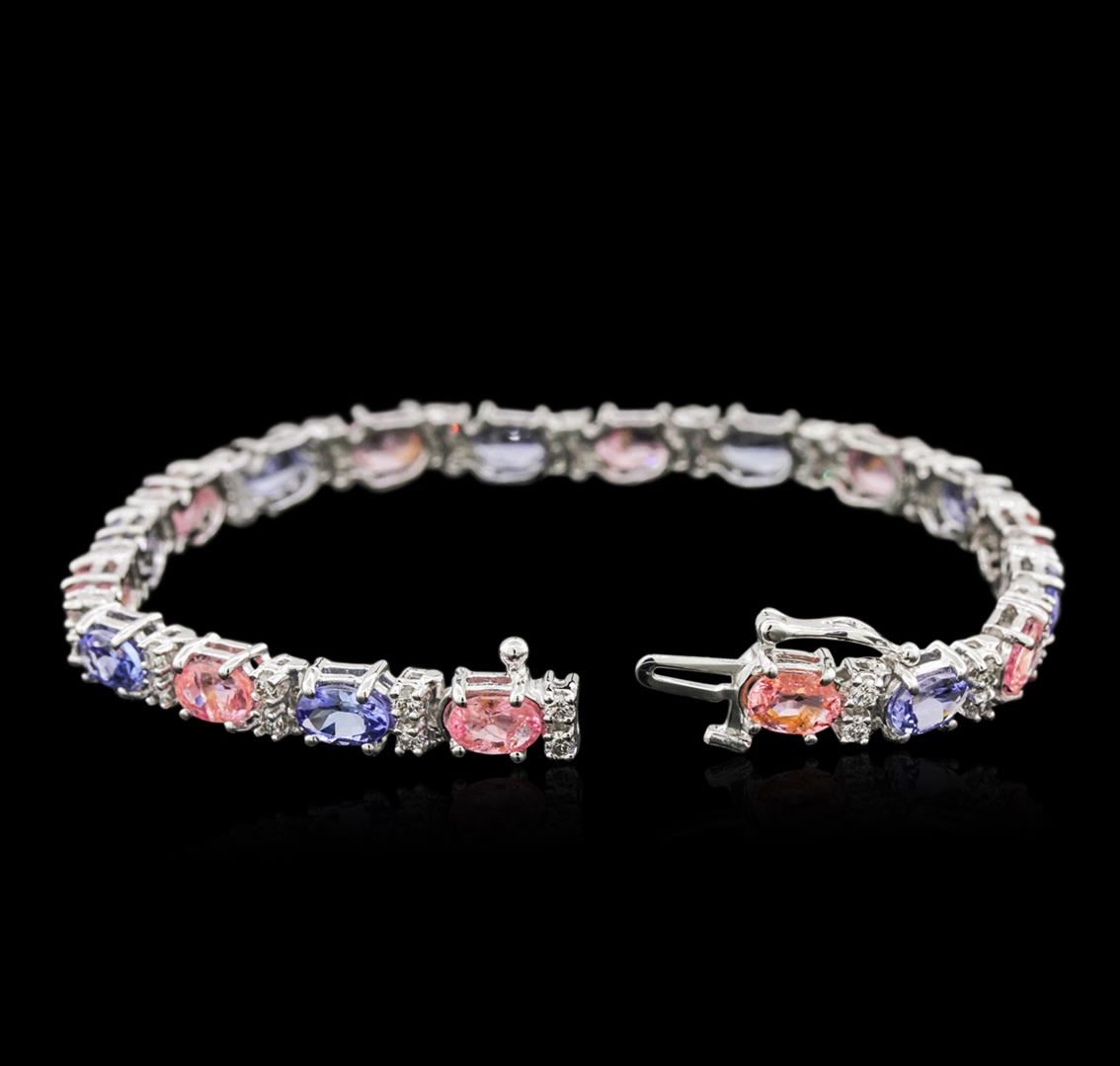 One electronically tested 14KT white gold ladies cast tanzanite, sapphire and diamond bracelet with a hidden box clasp with safety closer with a bright polish finish. Measurements: 7" in length Identified with markings of "14K". Condition is new. Containing: Nine prong set oval modified brilliant cut natural tanzanites, measuring 6.50 x 4.20 x 2.73mm, approximate total weight of 4.68ct., clarity is eye clean, type I, medium light, very slightly grayish, violet color, (GIA V 4/3), cut is good. Ten prong set oval modified brilliant cut natural pink sapphires, measuring 6.50 x 4.20 x 2.73mm, approximate total weight of 6.30ct., clarity is moderately included, type II, light, slightly grayish, purple color, (GIA P 3/2), cut is good. Thirty-Eight prong set round brilliant cut diamonds, measuring 1.60 - 1.60 x 0.96mm (depth est.) approximate total weight of 38 Stones = 0.57ct. Clarity: SI-1 to SI-2. Color: I - J, Cut is Good. Colored gemstones are presumed to have been subjected to commonly used enhancement processes. All diamonds and colored gemstones are graded in the mounting, unless otherwise stated. Total Weight of Colored Stones 10.98ct. Total Weight of Diamonds 0.57ct. Total Weight of Bracelet 13.60 grams. GGL Appraised at $5,110.00.