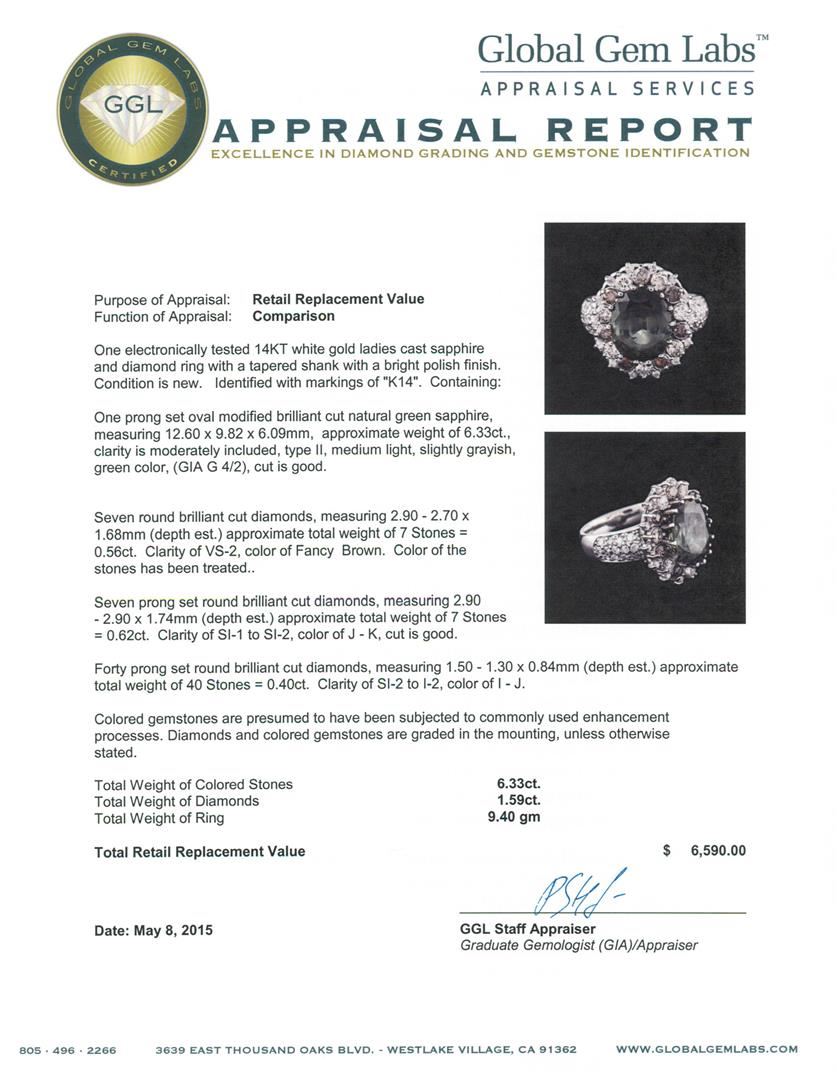 One electronically tested 14KT white gold ladies cast sapphire and diamond ring with a tapered shank with a bright polish finish. Identified with markings of "K14". Condition is new. Containing: One prong set oval modified brilliant cut natural green sapphire, measuring 12.60 x 9.82 x 6.09mm, approximate weight of 6.33ct., clarity is moderately included, type II, medium light, slightly grayish, green color, (GIA G 4/2), cut is good. Seven round brilliant cut diamonds, measuring 2.90 - 2.70 x 1.68mm (depth est.) approximate total weight of 7 Stones = 0.56ct. Clarity: VS-2, color of Fancy Brown. Color of the stones has been treated. Seven prong set round brilliant cut diamonds, measuring 2.90 - 2.90 x 1.74mm (depth est.) approximate total weight of 7 Stones = 0.62ct. Clarity: SI-1 to SI-2. Color: J - K, Cut is Good. Forty prong set round brilliant cut diamonds, measuring 1.50 - 1.30 x 0.84mm (depth est.) approximate total weight of 40 Stones = 0.40ct. Clarity: SI-2 to I-2. Color: I - J. Colored gemstones are presumed to have been subjected to commonly used enhancement processes. Diamonds and colored gemstones are graded in the mounting, unless otherwise stated. Total Weight of Colored Stones 6.33ct. Total Weight of Diamonds 1.59ct. Total Weight of Ring 9.40 grams. GGL Appraised at $6,590.00.