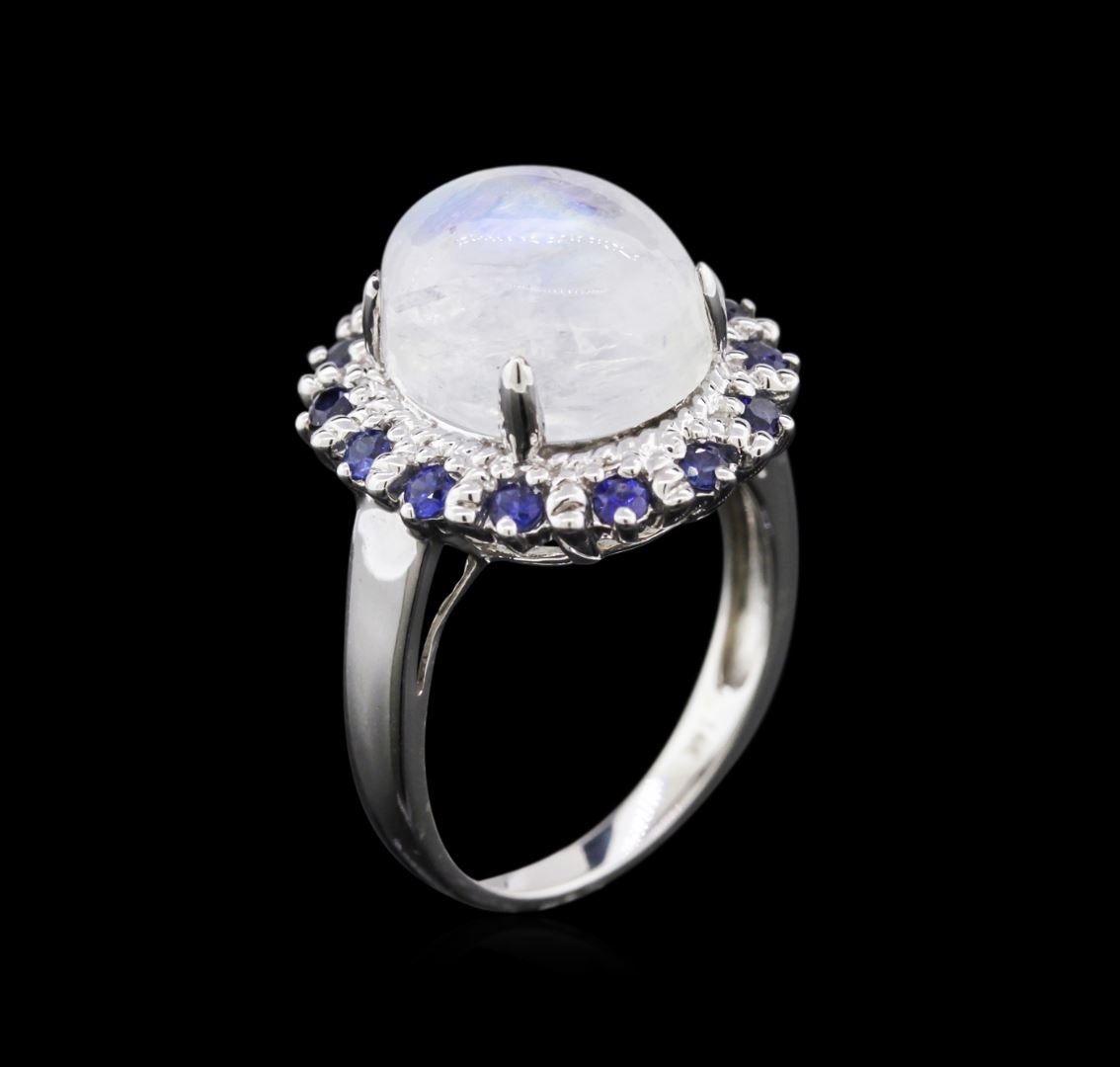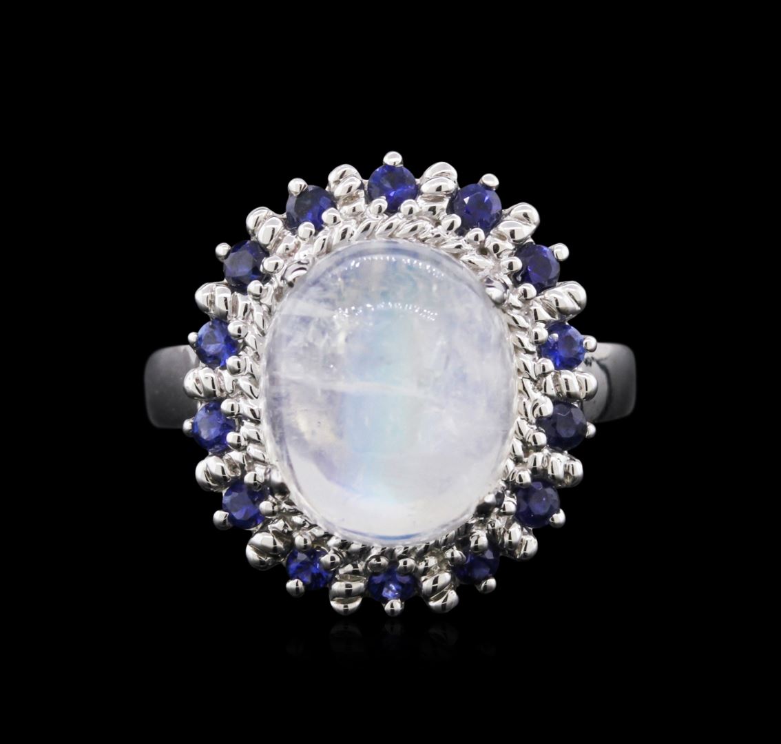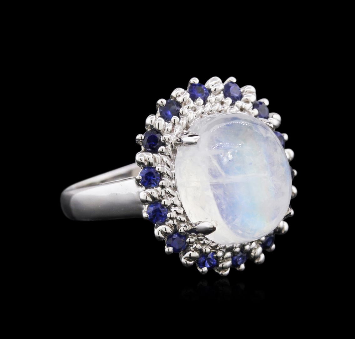 One ring featuring: 14KT white gold weighing 3.86 grams containing one blue moonstone center stone with a total weight of 6.34ct and 14 blue sapphires with a total weight of 0.54ct.