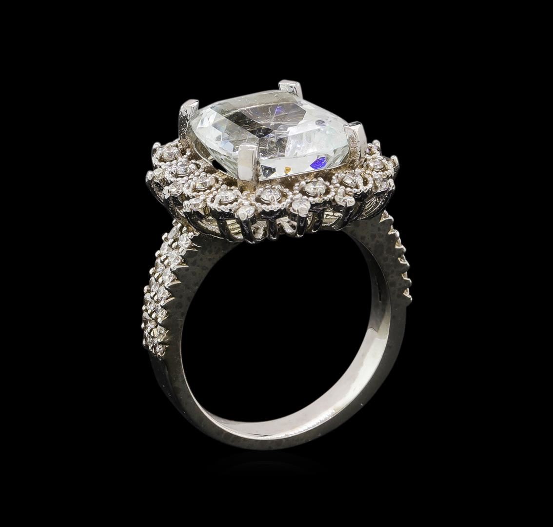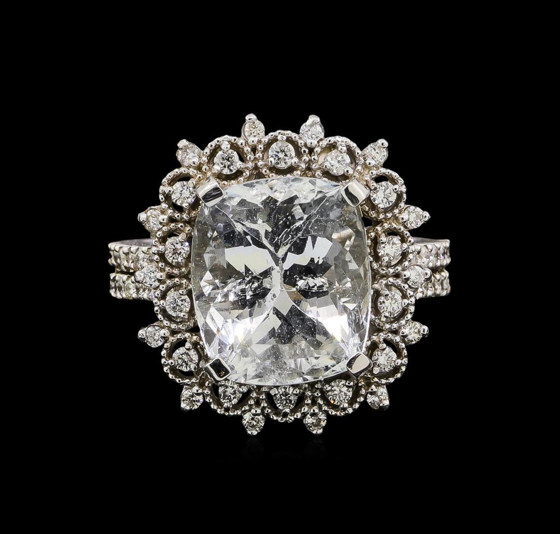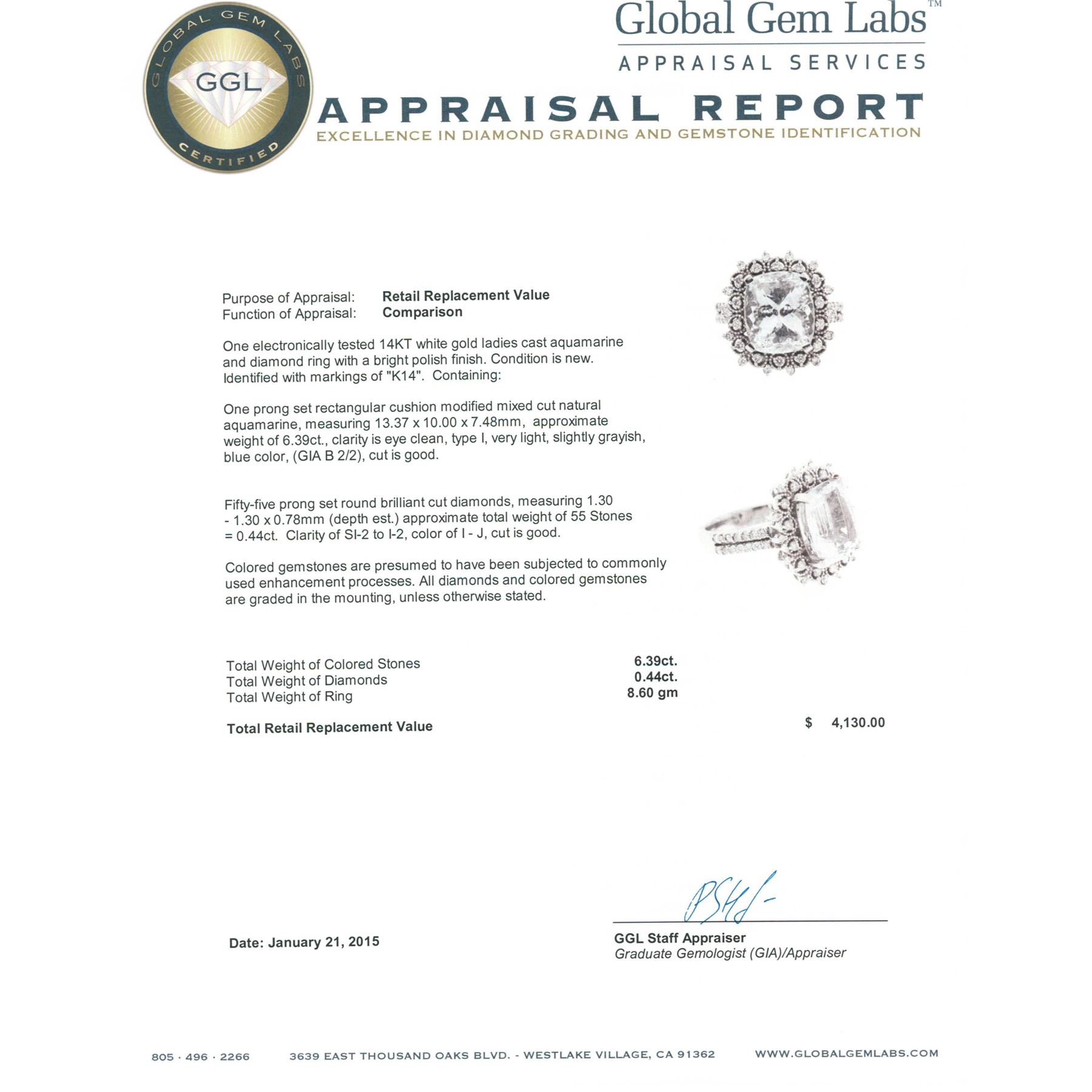 One electronically tested 14KT white gold ladies cast aquamarine and diamond ring with a bright polish finish. Identified with markings of "K14". Condition is new. Containing: One prong set rectangular cushion modified mixed cut natural aquamarine, measuring 13.37 x 10.00 x 7.48mm, approximate weight of 6.39ct., clarity is eye clean, type I, very light, slightly grayish, blue color, (GIA B 2/2), cut is good. Fifty-Five prong set round brilliant cut diamonds, measuring 1.30 - 1.30 x 0.78mm (depth est.) approximate total weight of 55 Stones = 0.44ct. Clarity: SI-2 to I-2. Color: I - J, Cut is Good. Colored gemstones are presumed to have been subjected to commonly used enhancement processes. All diamonds and colored gemstones are graded in the mounting, unless otherwise stated. Total Weight of Colored Stones 6.39ct. Total Weight of Diamonds 0.44ct. Total Weight of Ring 8.60 grams. GGL Appraised at $4,130.00.