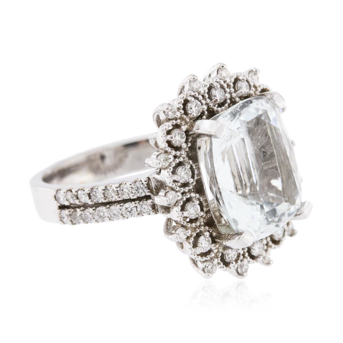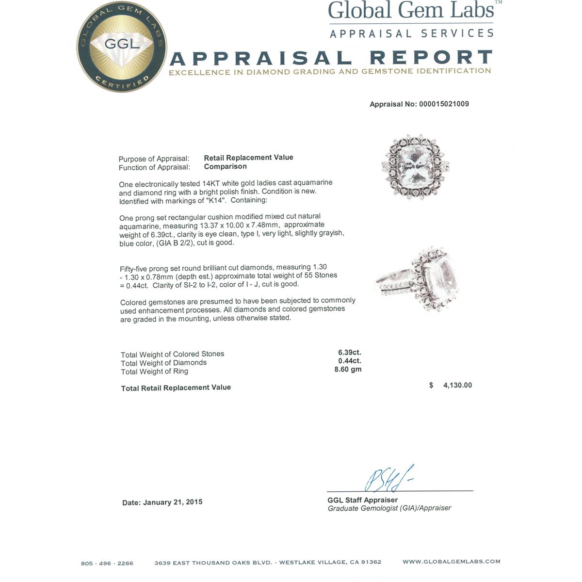 One electronically tested 14KT white gold ladies cast aquamarine and diamond ring with a bright polish finish. Identified with markings of "K14". Condition is new. Containing: One prong set rectangular cushion modified mixed cut natural aquamarine, measuring 13.37 x 10.00 x 7.48mm, approximate weight of 6.39ct., clarity is eye clean, type I, very light, slightly grayish, blue color, (GIA B 2/2), cut is good. Fifty-Five prong set round brilliant cut diamonds, measuring 1.30 - 1.30 x 0.78mm (depth est.) approximate total weight of 55 Stones = 0.44ct. Clarity: SI-2 to I-2. Color: I - J, Cut is Good. Colored gemstones are presumed to have been subjected to commonly used enhancement processes. All diamonds and colored gemstones are graded in the mounting, unless otherwise stated. Total Weight of Colored Stones 6.39ct. Total Weight of Diamonds 0.44ct. Total Weight of Ring 8.60 grams. GGL Appraised at $4,130.00.