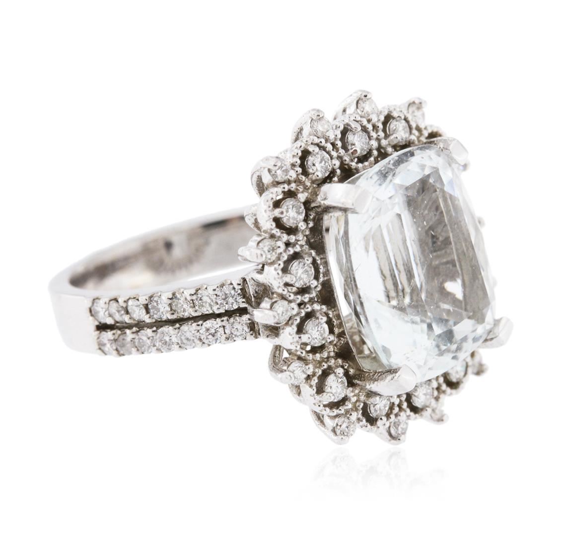 One electronically tested 14KT white gold ladies cast aquamarine and diamond ring with a bright polish finish. Identified with markings of "K14". Condition is new. Containing: One prong set rectangular cushion modified mixed cut natural aquamarine, measuring 13.37 x 10.00 x 7.48mm, approximate weight of 6.39ct., clarity is eye clean, type I, very light, slightly grayish, blue color, (GIA B 2/2), cut is good. Fifty-Five prong set round brilliant cut diamonds, measuring 1.30 - 1.30 x 0.78mm (depth est.) approximate total weight of 55 Stones = 0.44ct. Clarity: SI-2 to I-2. Color: I - J, Cut is Good. Colored gemstones are presumed to have been subjected to commonly used enhancement processes. All diamonds and colored gemstones are graded in the mounting, unless otherwise stated. Total Weight of Colored Stones 6.39ct. Total Weight of Diamonds 0.44ct. Total Weight of Ring 8.60 grams. GGL Appraised at $4,130.00.