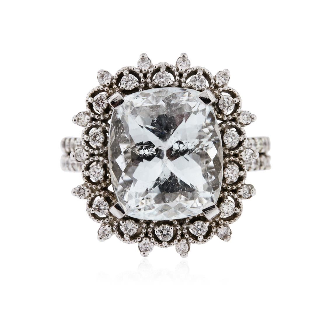One electronically tested 14KT white gold ladies cast aquamarine and diamond ring with a bright polish finish. Identified with markings of "K14". Condition is new. Containing: One prong set rectangular cushion modified mixed cut natural aquamarine, measuring 13.37 x 10.00 x 7.48mm, approximate weight of 6.39ct., clarity is eye clean, type I, very light, slightly grayish, blue color, (GIA B 2/2), cut is good. Fifty-Five prong set round brilliant cut diamonds, measuring 1.30 - 1.30 x 0.78mm (depth est.) approximate total weight of 55 Stones = 0.44ct. Clarity: SI-2 to I-2. Color: I - J, Cut is Good. Colored gemstones are presumed to have been subjected to commonly used enhancement processes. All diamonds and colored gemstones are graded in the mounting, unless otherwise stated. Total Weight of Colored Stones 6.39ct. Total Weight of Diamonds 0.44ct. Total Weight of Ring 8.60 grams. GGL Appraised at $4,130.00.