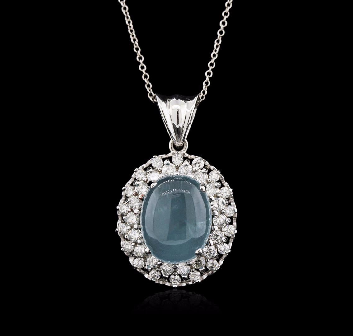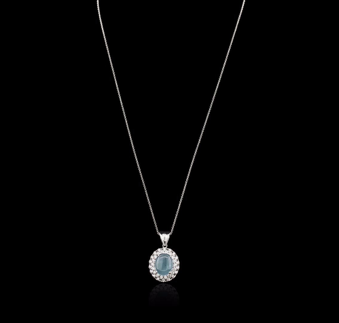 One electronically tested 14KT white gold ladies cast chalcedony and diamond pendant & chain 18.0" long, with a spring ring clasp with a bright polish finish. Identified with markings of "14K". Condition is new. Containing: One prong set oval cabochon cut natural chrysocolla, measuring 13.00 x 10.40 x 6.76mm, approximate weight of 6.42ct., clarity is heavily included, light, very slightly grayish, blue color, (GIA B 3/3), cut is good. Thirty-Six prong set round brilliant cut diamonds, measuring 2.00 - 1.50 x 1.05mm (depth est.) approximate total weight of 36 Stones = 0.71ct. Clarity: SI-2 to I-1. Color: I - J, Cut is Good. Colored gemstones are presumed to have been subjected to commonly used enhancement processes. All diamonds and colored gemstones are graded in the mounting, unless otherwise stated. Total Weight of Colored Stones 6.42ct. Total Weight of Diamonds 0.71ct. Total Weight of Pendant & Chain 7.10 grams. GGL Appraised at $3,625.00.