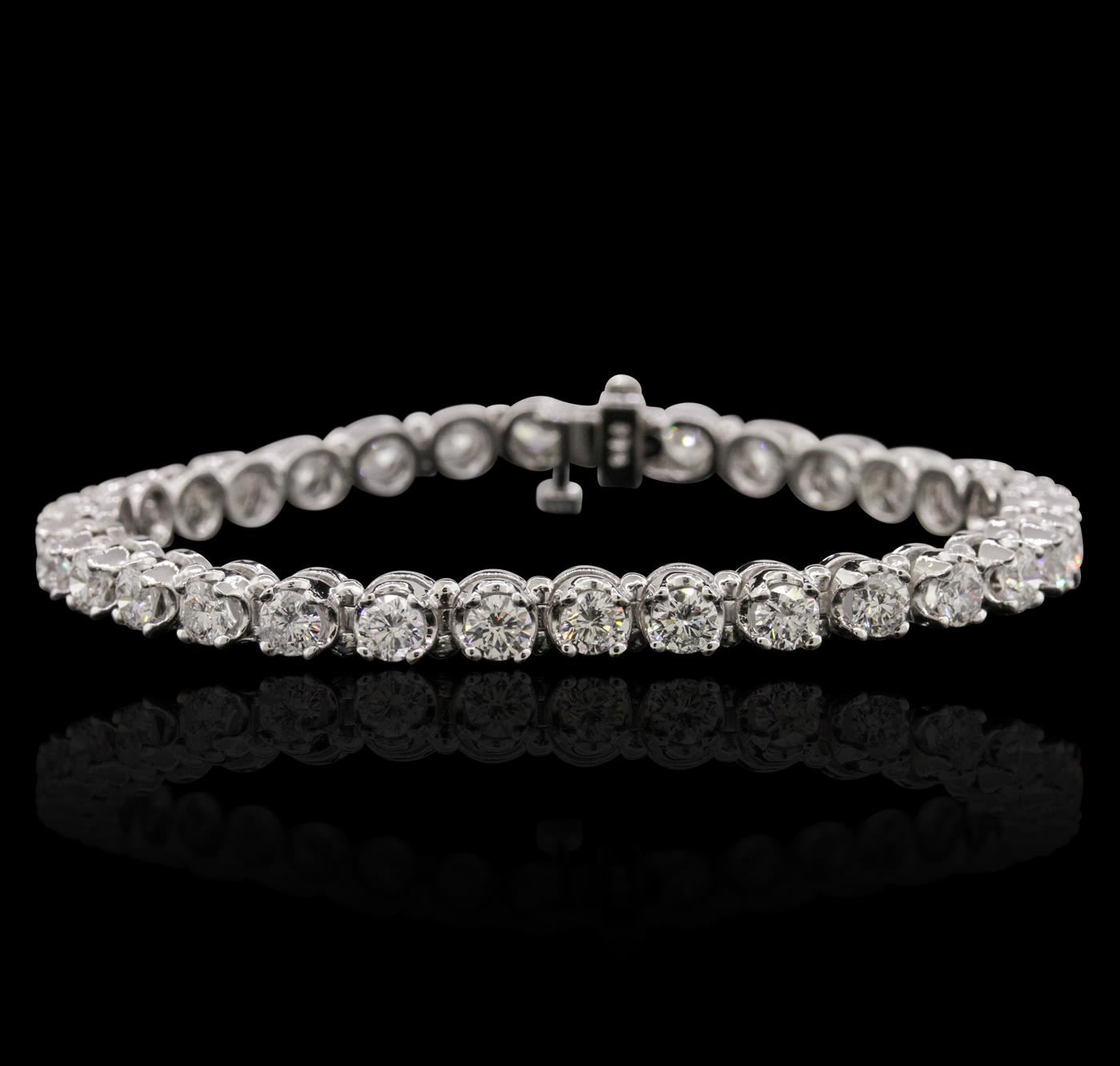 One electronically tested 14KT white gold ladies combination cast & assembled tennis bracelet with a hidden box clasp with a bright polish finish. Condition is new. Measurements: 7" in length. Identified with markings of "14K". Containing: Thirty-Two prong set round brilliant cut diamonds, measuring 3.80 - 3.80 x 2.28mm (depth est.) approximate total weight of 32 Stones = 6.43ct. Clarity: SI-1 to I-1. Color: I - J, Cut is Good. All diamonds are graded in the mounting, unless otherwise stated. Total Weight of Diamonds 6.43ct. Total Weight of Bracelet 18.10 grams. GGL Appraised at $27,740.00.