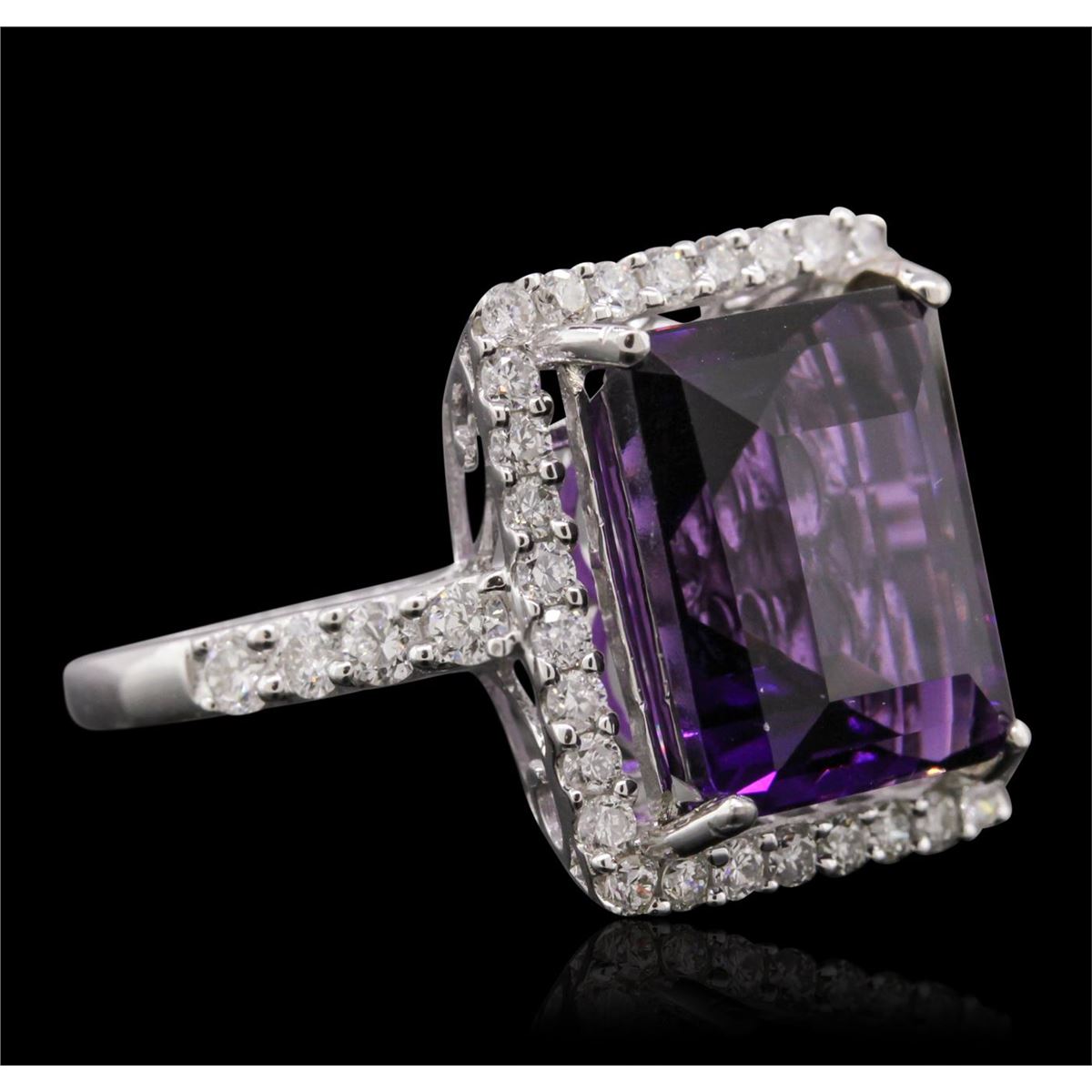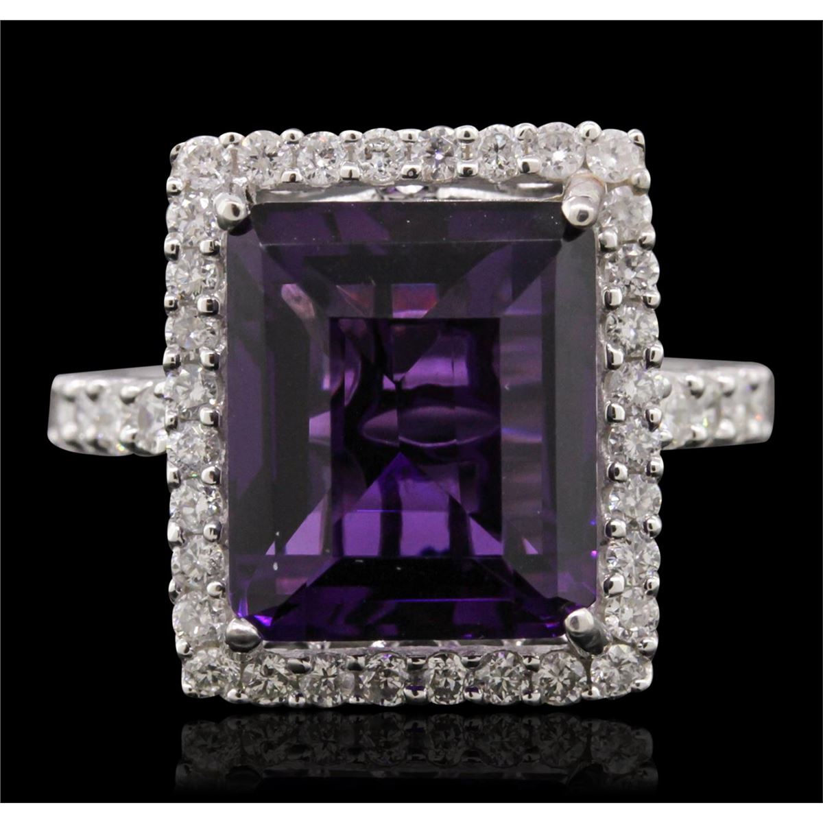 One electronically tested 14KT white gold Ladies combination cast & assembled ring with a bright polish finish. Condition is new. Identified with markings of "14K". Containing: One prong set emerald standard step cut natural amethyst, measuring 12.22 x 10.17 x 7.20mm, approximate weight of 6.43ct., clarity is eye clean, type II, medium, moderately strong, purple color, (GIA P 5/4), cut is good. Colored gemstones are presumed to have been subjected to commonly used color/clarity enhancement processes. Forty prong set round brilliant cut diamonds, measuring 2.00 - 1.50 x 1.05mm (depth est.) approximate. Total Weight of 40 Stones = 0.78ct. Clarity: I-1 to I-2. Color: H - I, Cut is Good. All grading of diamonds and colored gemstones in this piece of jewelry are graded in the mounting, unless otherwise stated. Total Weight of Colored Stones 6.43ct. Total Weight of Diamonds 0.78ct. Total Weight of Ring 4.60 grams. GGL Appraised at $4,420.00.