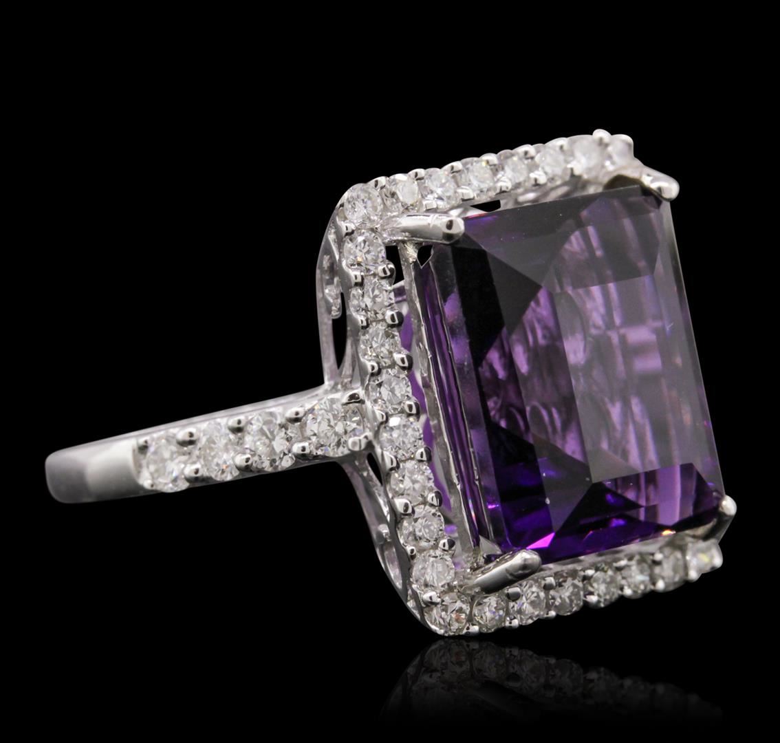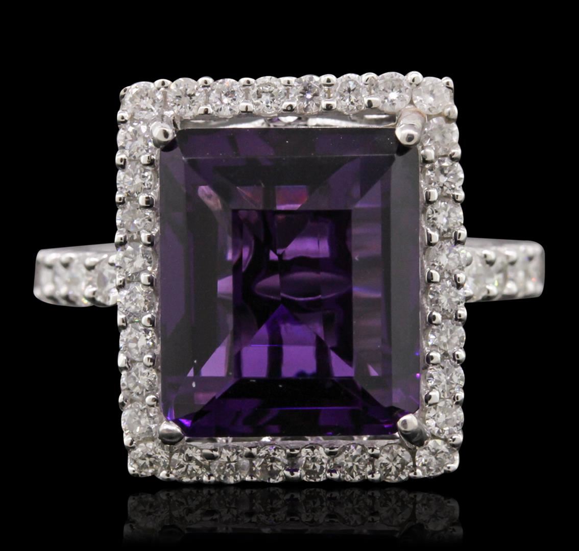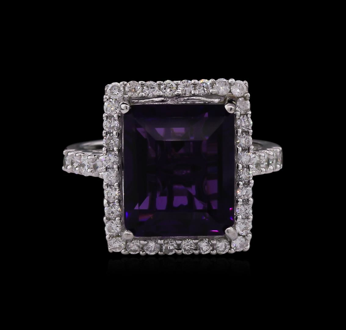 One electronically tested 14KT white gold Ladies combination cast & assembled ring with a bright polish finish. Condition is new. Identified with markings of "14K". Containing: One prong set emerald standard step cut natural amethyst, measuring 12.22 x 10.17 x 7.20mm, approximate weight of 6.43ct., clarity is eye clean, type II, medium, moderately strong, purple color, (GIA P 5/4), cut is good. Colored gemstones are presumed to have been subjected to commonly used color/clarity enhancement processes. Forty prong set round brilliant cut diamonds, measuring 2.00 - 1.50 x 1.05mm (depth est.) approximate. Total Weight of 40 Stones = 0.78ct. Clarity: I-1 to I-2. Color: H - I, Cut is Good. All grading of diamonds and colored gemstones in this piece of jewelry are graded in the mounting, unless otherwise stated. Total Weight of Colored Stones 6.43ct. Total Weight of Diamonds 0.78ct. Total Weight of Ring 4.60 grams. GGL Appraised at $4,420.00.