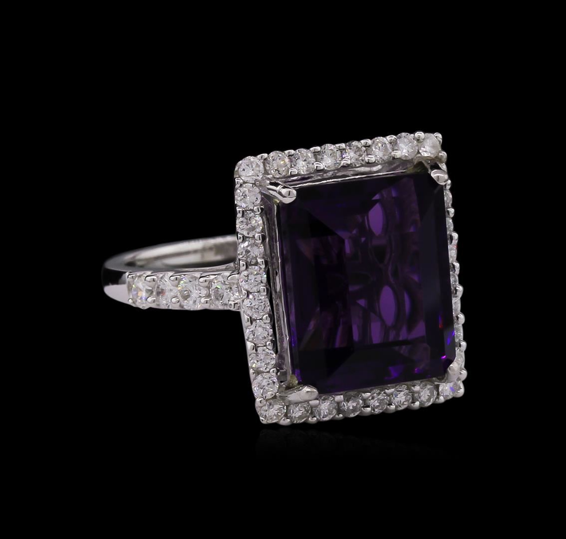 One electronically tested 14KT white gold Ladies combination cast & assembled ring with a bright polish finish. Condition is new. Identified with markings of "14K". Containing: One prong set emerald standard step cut natural amethyst, measuring 12.22 x 10.17 x 7.20mm, approximate weight of 6.43ct., clarity is eye clean, type II, medium, moderately strong, purple color, (GIA P 5/4), cut is good. Colored gemstones are presumed to have been subjected to commonly used color/clarity enhancement processes. Forty prong set round brilliant cut diamonds, measuring 2.00 - 1.50 x 1.05mm (depth est.) approximate. Total Weight of 40 Stones = 0.78ct. Clarity: I-1 to I-2. Color: H - I, Cut is Good. All grading of diamonds and colored gemstones in this piece of jewelry are graded in the mounting, unless otherwise stated. Total Weight of Colored Stones 6.43ct. Total Weight of Diamonds 0.78ct. Total Weight of Ring 4.60 grams. GGL Appraised at $4,420.00.