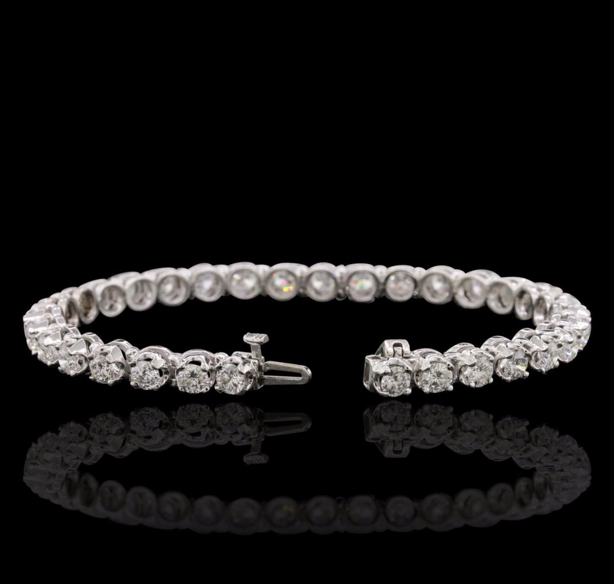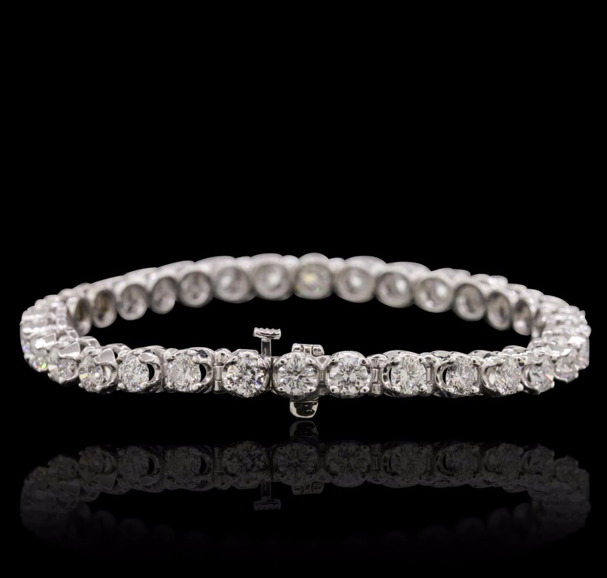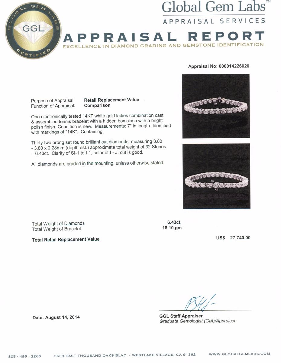 One electronically tested 14KT white gold ladies combination cast & assembled tennis bracelet with a hidden box clasp with a bright polish finish. Condition is new. Measurements: 7" in length. Identified with markings of "14K". Containing: Thirty-Two prong set round brilliant cut diamonds, measuring 3.80 - 3.80 x 2.28mm (depth est.) approximate total weight of 32 Stones = 6.43ct. Clarity: SI-1 to I-1. Color: I - J, Cut is Good. All diamonds are graded in the mounting, unless otherwise stated. Total Weight of Diamonds 6.43ct. Total Weight of Bracelet 18.10 grams. GGL Appraised at $27,740.00.
