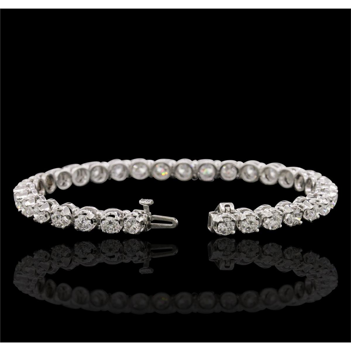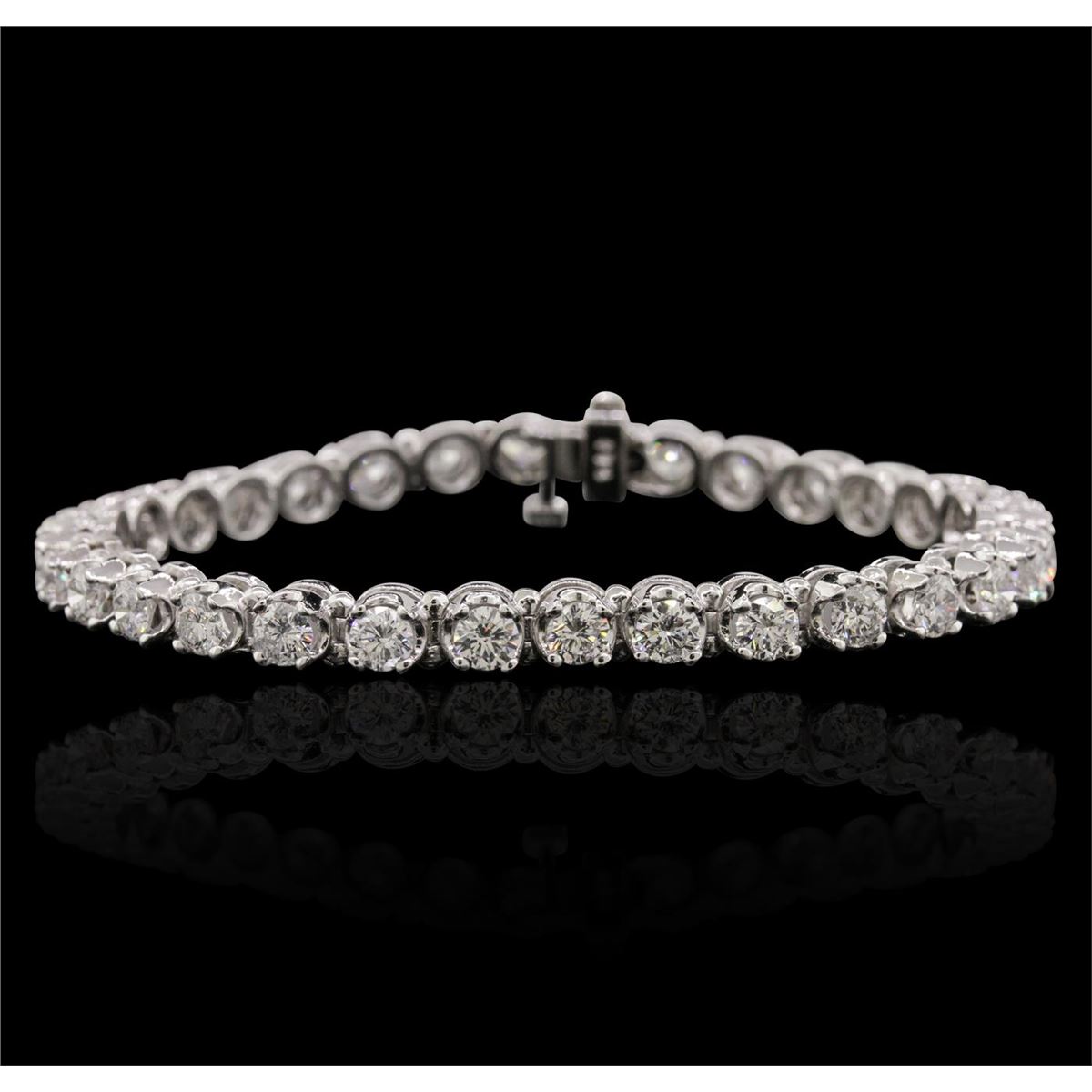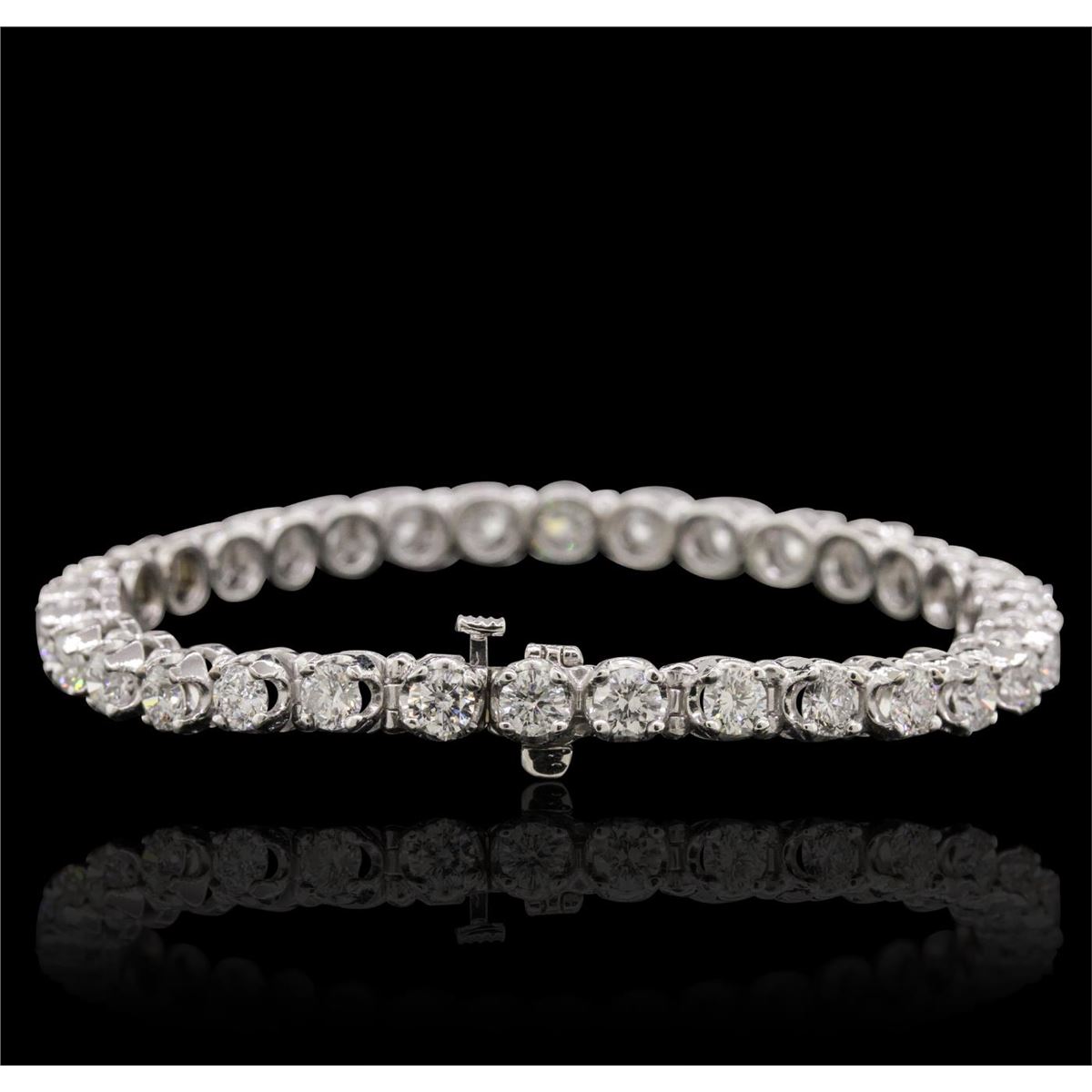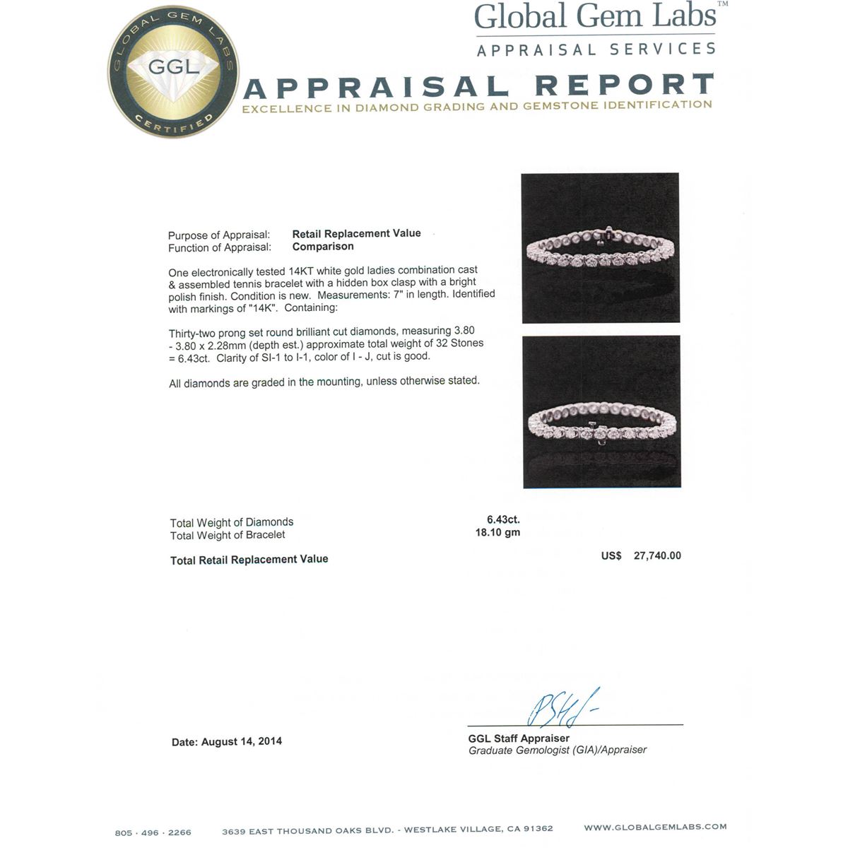One electronically tested 14KT white gold ladies combination cast & assembled tennis bracelet with a hidden box clasp with a bright polish finish. Condition is new. Measurements: 7" in length. Identified with markings of "14K". Containing: Thirty-Two prong set round brilliant cut diamonds, measuring 3.80 - 3.80 x 2.28mm (depth est.) approximate total weight of 32 Stones = 6.43ct. Clarity: SI-1 to I-1. Color: I - J, Cut is Good. All diamonds are graded in the mounting, unless otherwise stated. Total Weight of Diamonds 6.43ct. Total Weight of Bracelet 18.10 grams. GGL Appraised at $27,740.00.