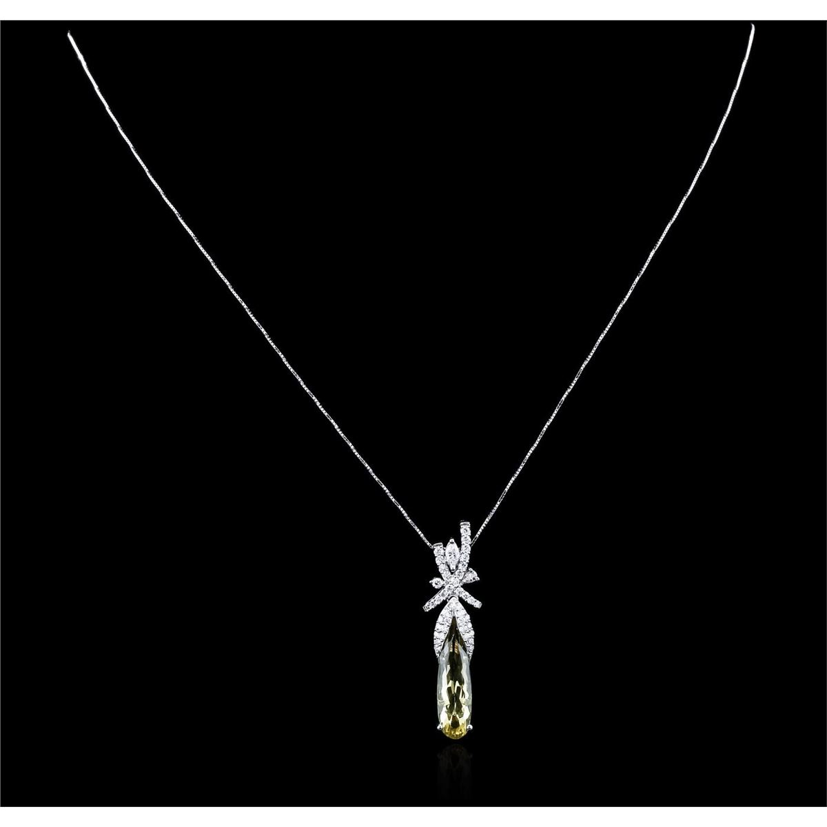 One electronically tested 14KT white gold ladies combination cast & assembled citrine and diamond pendant & chain 16.0" long, box link with a spring ring clasp with a bright polish finish. Identified with markings of "14K". Condition is new. Containing: One prong set pear modified mixed cut natural citrine quartz, measuring 28.00. x 7.09 x 6.10mm, approximate weight of 6.44ct., clarity is eye clean, type I, medium light, brownish, green color, (GIA yO 4/3), cut is good. Forty-Three prong set round brilliant cut diamonds, measuring 1.80 - 1.30 x 0.93mm (depth est.) approximate total weight of 43 Stones = 0.59ct. Clarity: SI-1 to SI-2. Color: I - J, Cut is Good. One prong set marquise shaped cut diamond, measuring 5.00. x 2.50 x 1.58mm (depth est.) approximate weight of 0.12ct. Clarity: SI-1. Color: I, Cut is Good. One prong set pear shaped cut diamond, measuring 3.00. x 2.50 x 1.58mm (depth est.) approximate weight of 0.07ct. Clarity: SI-1. Color: I, Cut is Good. Colored gemstones are presumed to have been subjected to commonly used enhancement processes. All diamonds and colored gemstones are graded in the mounting, unless otherwise stated. Total Weight of Colored Stones 6.44ct. Total Weight of Diamonds 0.77ct. Total Weight of Pendant & Chain 6.40 grams. GGL Appraised at $3,465.00.