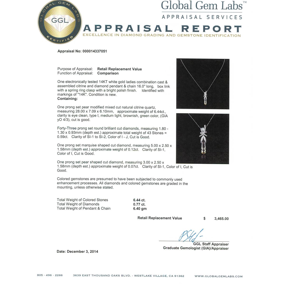 One electronically tested 14KT white gold ladies combination cast & assembled citrine and diamond pendant & chain 16.0" long, box link with a spring ring clasp with a bright polish finish. Identified with markings of "14K". Condition is new. Containing: One prong set pear modified mixed cut natural citrine quartz, measuring 28.00. x 7.09 x 6.10mm, approximate weight of 6.44ct., clarity is eye clean, type I, medium light, brownish, green color, (GIA yO 4/3), cut is good. Forty-Three prong set round brilliant cut diamonds, measuring 1.80 - 1.30 x 0.93mm (depth est.) approximate total weight of 43 Stones = 0.59ct. Clarity: SI-1 to SI-2. Color: I - J, Cut is Good. One prong set marquise shaped cut diamond, measuring 5.00. x 2.50 x 1.58mm (depth est.) approximate weight of 0.12ct. Clarity: SI-1. Color: I, Cut is Good. One prong set pear shaped cut diamond, measuring 3.00. x 2.50 x 1.58mm (depth est.) approximate weight of 0.07ct. Clarity: SI-1. Color: I, Cut is Good. Colored gemstones are presumed to have been subjected to commonly used enhancement processes. All diamonds and colored gemstones are graded in the mounting, unless otherwise stated. Total Weight of Colored Stones 6.44ct. Total Weight of Diamonds 0.77ct. Total Weight of Pendant & Chain 6.40 grams. GGL Appraised at $3,465.00.