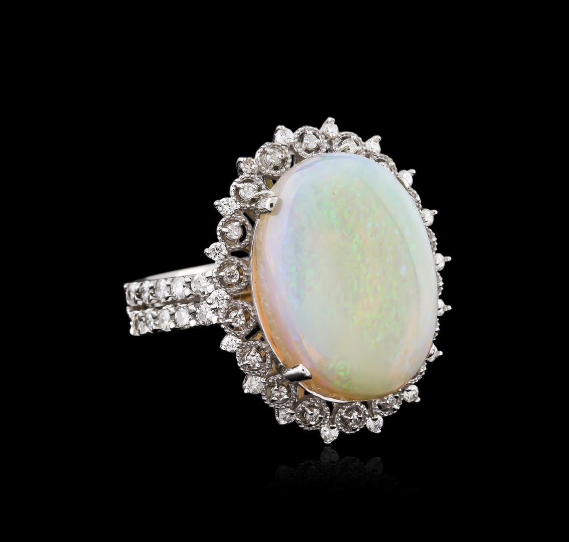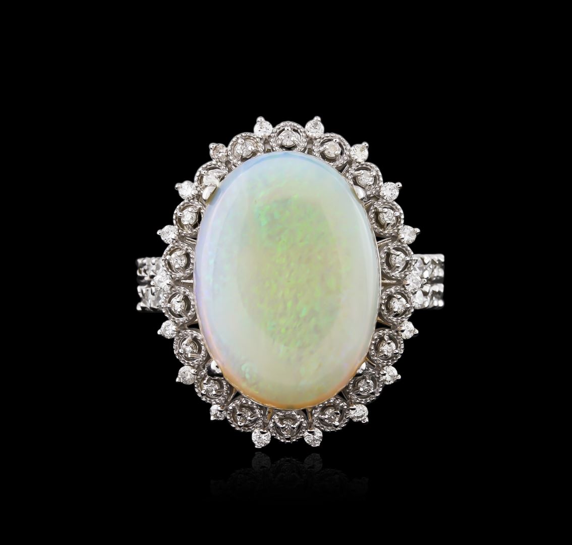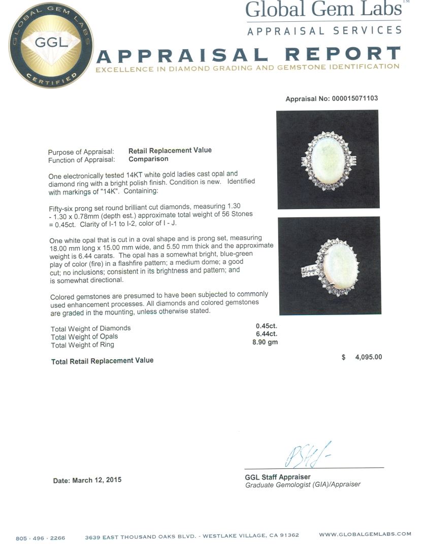 One electronically tested 14KT white gold ladies cast opal and diamond ring with a bright polish finish. Identified with markings of "14K". Condition is new. Containing: Fifty-Six prong set round brilliant cut diamonds, measuring 1.30 - 1.30 x 0.78mm (depth est.) approximate total weight of 56 Stones = 0.45ct. Clarity: I-1 to I-2. Color: I - J. One white opal that is cut in a oval shape and is prong set, measuring 18.00. mm long x 15.00. mm wide, and 5.50 mm thick and the approximate weight is 6.44 carats. The opal has a somewhat bright, blue-green play of color (fire) in a flashfire pattern; a medium dome; a good cut; no inclusions; consistent in its brightness and pattern; and is somewhat directional. Colored gemstones are presumed to have been subjected to commonly used enhancement processes. All diamonds and colored gemstones are graded in the mounting, unless otherwise stated. Total Weight of Diamonds 0.45ct. Total Weight of Opals 6.44ct. Total Weight of Ring 8.90 grams. GGL Appraised at $4,095.00.