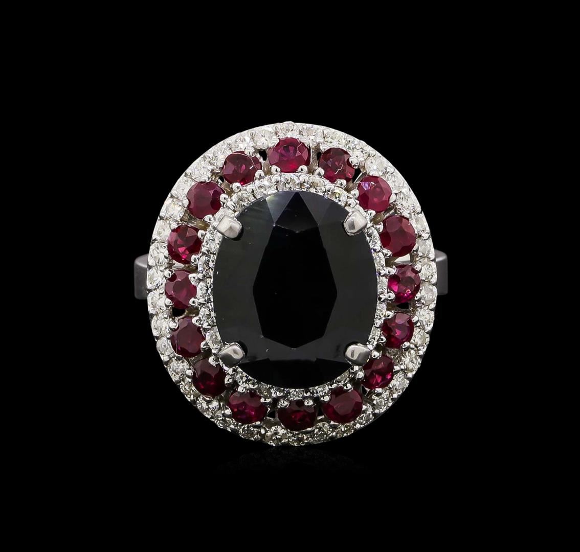 One electronically tested 14KT white gold ladies cast ruby, sapphire and diamond ring with a bright polish finish. Identified with markings of "14K". Condition is new. Containing: One prong set oval modified brilliant cut natural blue sapphire, measuring 11.86 x 9.98 x 6.49mm, approximate weight of 6.45ct., clarity is heavily included, type II, very dark, strong, blue color, (GIA B 8/5), cut is good. Sixteen prong set round modified brilliant cut natural rubies, measuring 2.00 - 2.00 x 1.30 mm, approximate total weight of 0.64ct., clarity is moderately included, medium, moderately strong, strongly purplish red color, (GIA stpR 5/4), cut is good. Sixty prong set round brilliant cut diamonds, measuring 1.30 - 1.30 x 0.78mm (depth est.) approximate total weight of 60 Stones = 0.48ct. Clarity: SI-2 to I-1. Color: I - J, Cut is Good. Colored gemstones are presumed to have been subjected to commonly used enhancement processes. All diamonds and colored gemstones are graded in the mounting, unless otherwise stated. Total Weight of Colored Stones 7.09ct. Total Weight of Diamonds 0.48ct. Total Weight of Ring 8.90 grams. GGL Appraised at $4,550.00.