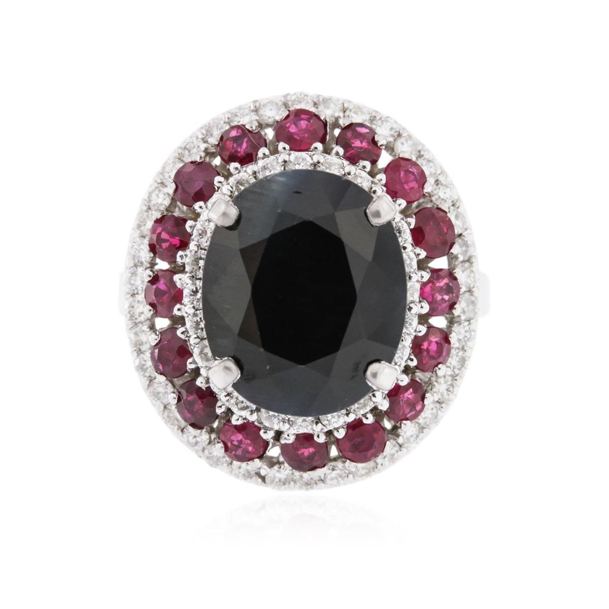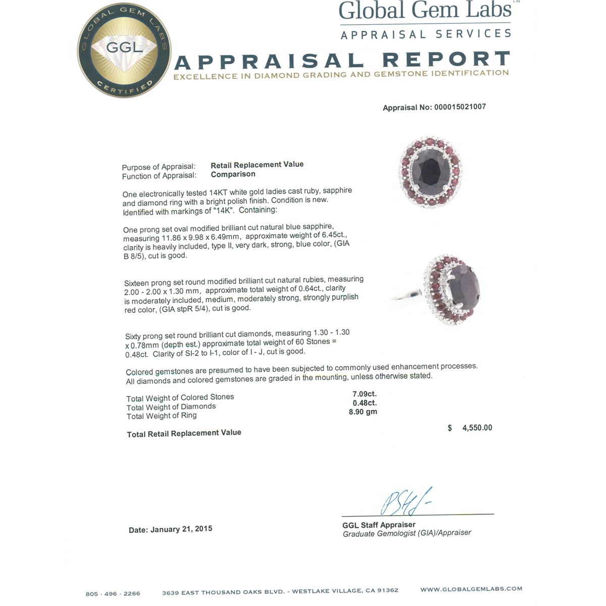 One electronically tested 14KT white gold ladies cast ruby, sapphire and diamond ring with a bright polish finish. Identified with markings of "14K". Condition is new. Containing: One prong set oval modified brilliant cut natural blue sapphire, measuring 11.86 x 9.98 x 6.49mm, approximate weight of 6.45ct., clarity is heavily included, type II, very dark, strong, blue color, (GIA B 8/5), cut is good. Sixteen prong set round modified brilliant cut natural rubies, measuring 2.00 - 2.00 x 1.30 mm, approximate total weight of 0.64ct., clarity is moderately included, medium, moderately strong, strongly purplish red color, (GIA stpR 5/4), cut is good. Sixty prong set round brilliant cut diamonds, measuring 1.30 - 1.30 x 0.78mm (depth est.) approximate total weight of 60 Stones = 0.48ct. Clarity: SI-2 to I-1. Color: I - J, Cut is Good. Colored gemstones are presumed to have been subjected to commonly used enhancement processes. All diamonds and colored gemstones are graded in the mounting, unless otherwise stated. Total Weight of Colored Stones 7.09ct. Total Weight of Diamonds 0.48ct. Total Weight of Ring 8.90 grams. GGL Appraised at $4,550.00.