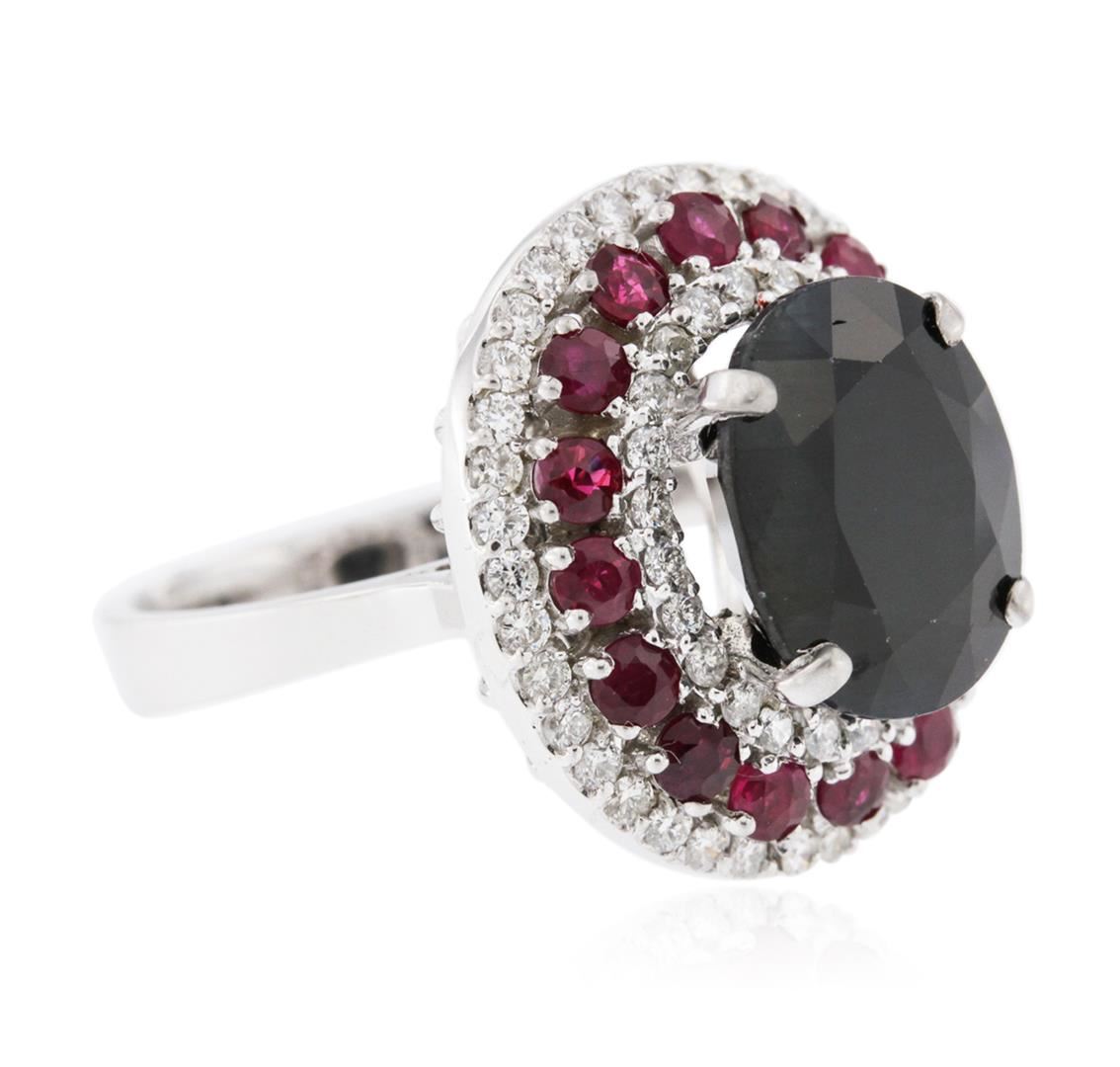 One electronically tested 14KT white gold ladies cast ruby, sapphire and diamond ring with a bright polish finish. Identified with markings of "14K". Condition is new. Containing: One prong set oval modified brilliant cut natural blue sapphire, measuring 11.86 x 9.98 x 6.49mm, approximate weight of 6.45ct., clarity is heavily included, type II, very dark, strong, blue color, (GIA B 8/5), cut is good. Sixteen prong set round modified brilliant cut natural rubies, measuring 2.00 - 2.00 x 1.30 mm, approximate total weight of 0.64ct., clarity is moderately included, medium, moderately strong, strongly purplish red color, (GIA stpR 5/4), cut is good. Sixty prong set round brilliant cut diamonds, measuring 1.30 - 1.30 x 0.78mm (depth est.) approximate total weight of 60 Stones = 0.48ct. Clarity: SI-2 to I-1. Color: I - J, Cut is Good. Colored gemstones are presumed to have been subjected to commonly used enhancement processes. All diamonds and colored gemstones are graded in the mounting, unless otherwise stated. Total Weight of Colored Stones 7.09ct. Total Weight of Diamonds 0.48ct. Total Weight of Ring 8.90 grams. GGL Appraised at $4,550.00.