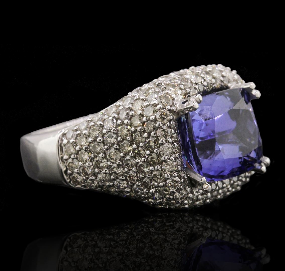 One electronically tested 14KT white gold Ladies combination cast & assembled ring with a bright polish finish. Condition is new. Identified with markings of "585". Containing: One prong set rectangular cushion modified brilliant cut natural tanzanite, measuring 11.60 x 9.70 x 7.30mm, approximate weight of 6.47ct., clarity is eye clean, type I, medium, moderately strong, bluish violet color, (GIA bV 5/4), cut is good. Colored gemstones are presumed to have been subjected to commonly used color/clarity enhancement processes. One Hundred Seventy-Four prong set round brilliant cut diamonds, measuring 1.70 - 1.70 x 1.02mm (depth est.) approximate. Total Weight of 174 Stones = 3.12ct. Clarity: SI-2 to I-1. Color: K - L, Cut is Good. Total Weight of Colored Stones 6.47ct. Total Weight of Diamonds 3.12ct. Total Weight of Ring 12.50 grams. GGL Appraised at $17,840.00.