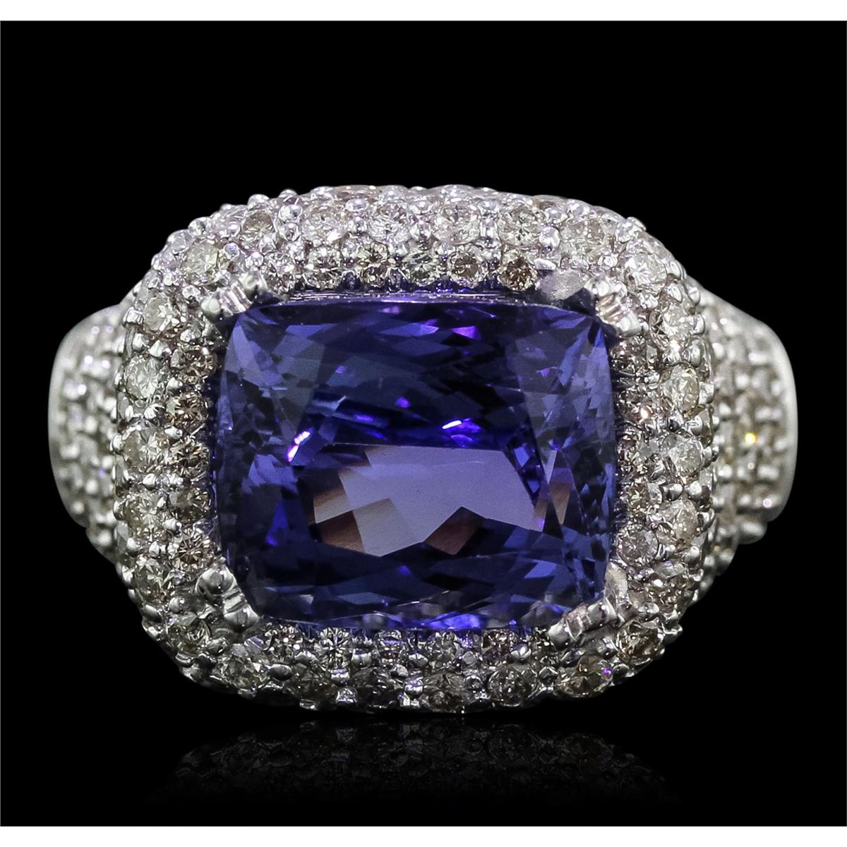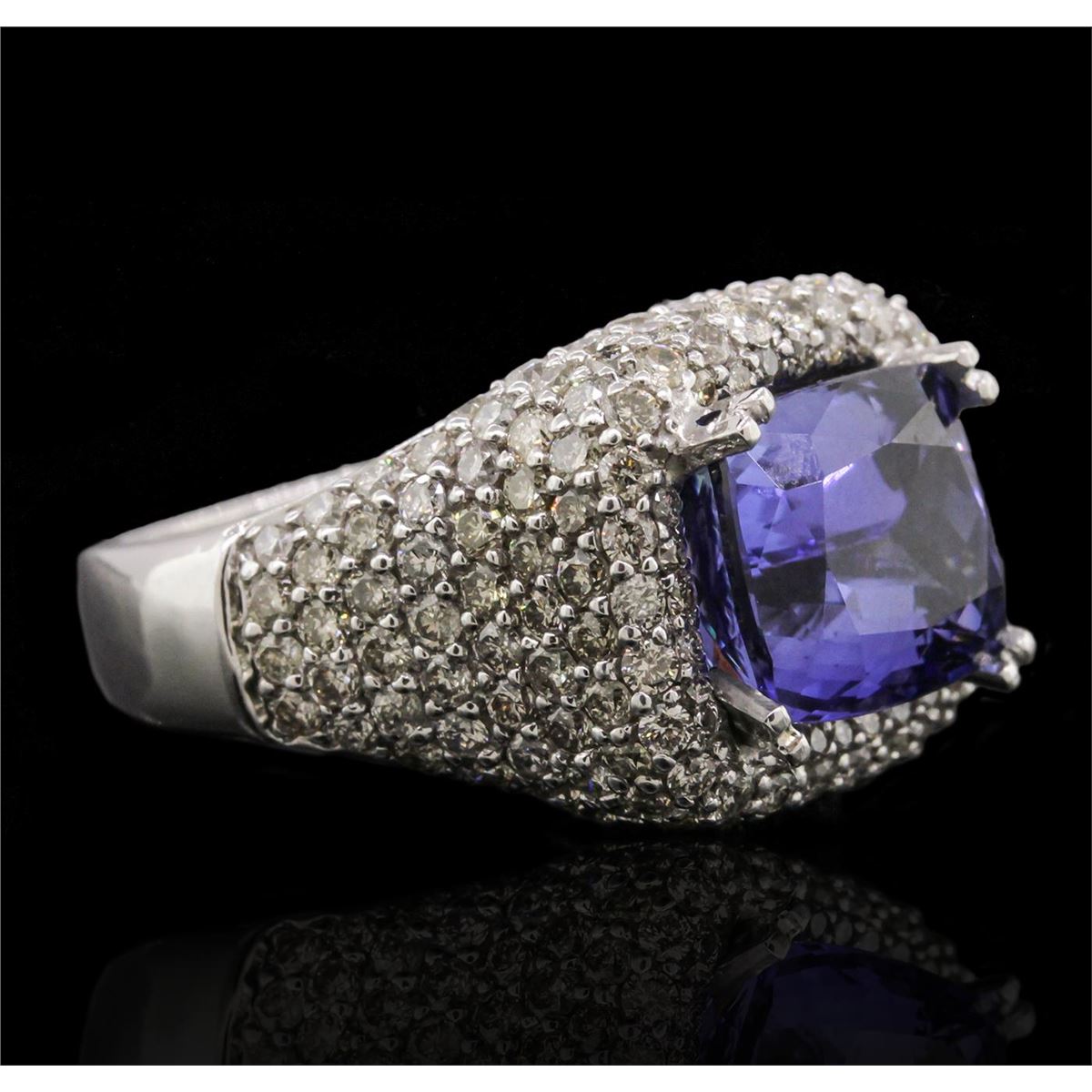 One electronically tested 14KT white gold Ladies combination cast & assembled ring with a bright polish finish. Condition is new. Identified with markings of "585". Containing: One prong set rectangular cushion modified brilliant cut natural tanzanite, measuring 11.60 x 9.70 x 7.30mm, approximate weight of 6.47ct., clarity is eye clean, type I, medium, moderately strong, bluish violet color, (GIA bV 5/4), cut is good. Colored gemstones are presumed to have been subjected to commonly used color/clarity enhancement processes. One Hundred Seventy-Four prong set round brilliant cut diamonds, measuring 1.70 - 1.70 x 1.02mm (depth est.) approximate. Total Weight of 174 Stones = 3.12ct. Clarity: SI-2 to I-1. Color: K - L, Cut is Good. Total Weight of Colored Stones 6.47ct. Total Weight of Diamonds 3.12ct. Total Weight of Ring 12.50 grams. GGL Appraised at $17,840.00.