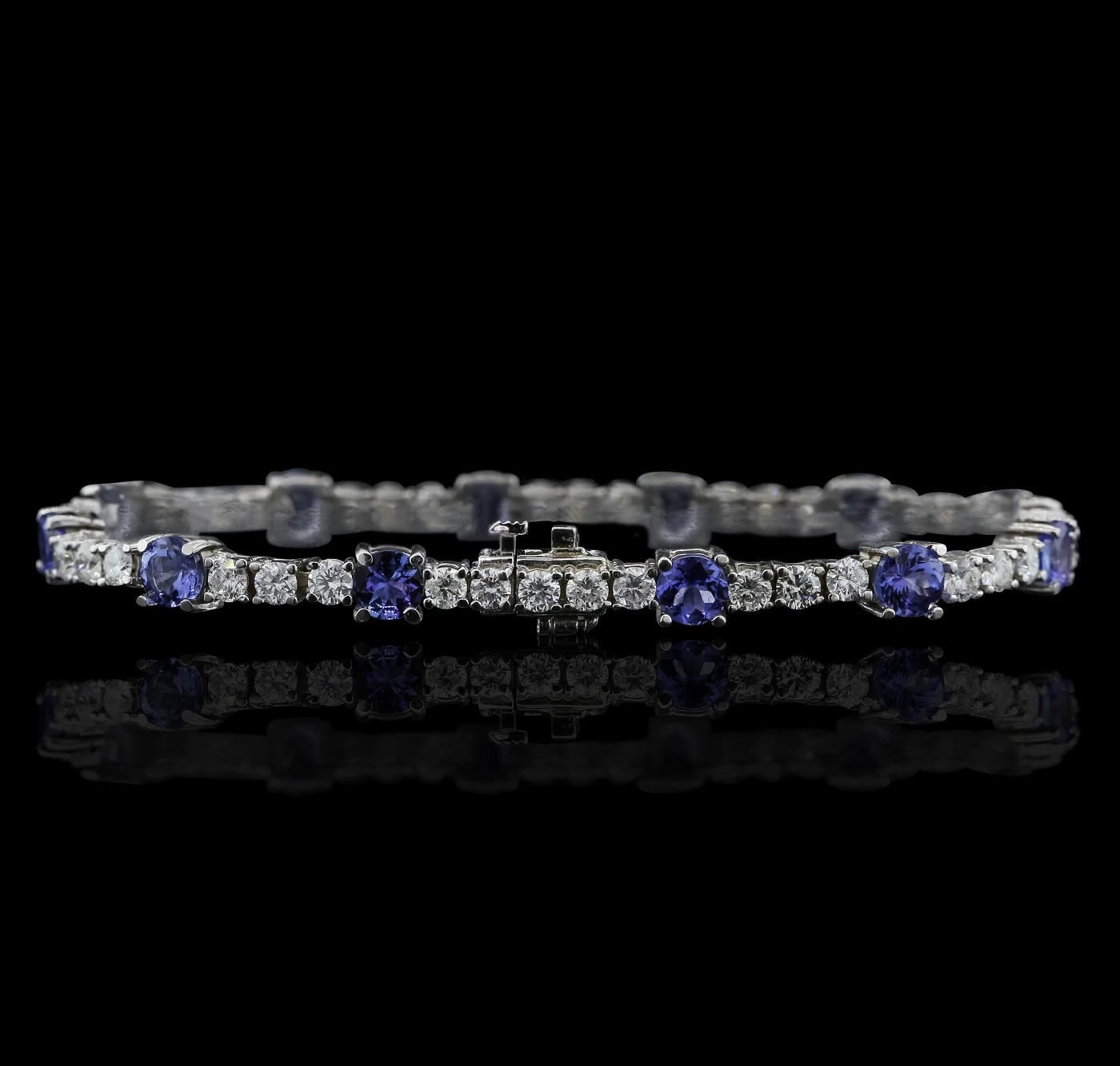 One electronically tested 14KT white gold ladies combination cast & assembled tennis bracelet with a hidden box clasp with a bright polish finish. Condition is new. Measurements: 7" in length. Identified with markings of "14K". Containing: Twelve prong set round modified brilliant cut natural tanzanites, measuring 5.00 - 5.00 x 3.25 mm, approximate total weight of 6.48ct., clarity is eye clean, type I, medium light, moderately strong, bluish violet color, (GIA bV 4/4), cut is very good. Thirty-Eight prong set round brilliant cut diamonds, measuring 3.00 - 3.00 x 1.80mm (depth est.) approximate total weight of 38 Stones = 3.75ct. Clarity: SI-1 to I-1. Color: H - J, Cut is Good. Colored gemstones are presumed to have been subjected to commonly used enhancement processes. All diamonds and colored gemstones are graded in the mounting, unless otherwise stated. Total Weight of Colored Stones 6.48ct. Total Weight of Diamonds 3.75ct. Total Weight of Bracelet 15.40 grams. GGL Appraised at $14,310.00.