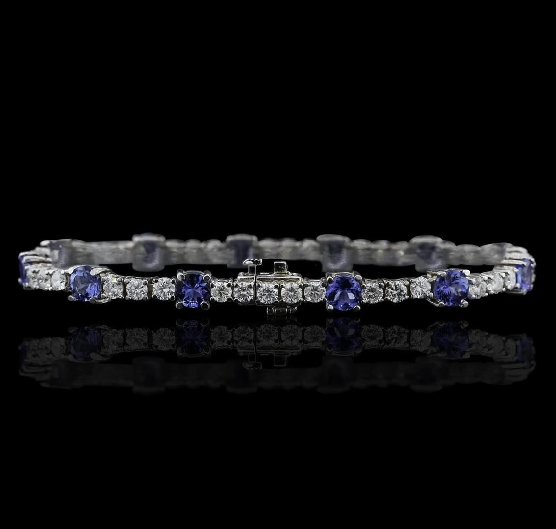 One electronically tested 14KT white gold ladies combination cast & assembled tennis bracelet with a hidden box clasp with a bright polish finish. Condition is new. Measurements: 7" in length. Identified with markings of "14K". Containing: Twelve prong set round modified brilliant cut natural tanzanites, measuring 5.00 - 5.00 x 3.25 mm, approximate total weight of 6.48ct., clarity is eye clean, type I, medium light, moderately strong, bluish violet color, (GIA bV 4/4), cut is very good. Thirty-Eight prong set round brilliant cut diamonds, measuring 3.00 - 3.00 x 1.80mm (depth est.) approximate total weight of 38 Stones = 3.75ct. Clarity: SI-1 to I-1. Color: H - J, Cut is Good. Colored gemstones are presumed to have been subjected to commonly used enhancement processes. All diamonds and colored gemstones are graded in the mounting, unless otherwise stated. Total Weight of Colored Stones 6.48ct. Total Weight of Diamonds 3.75ct. Total Weight of Bracelet 15.40 grams. GGL Appraised.