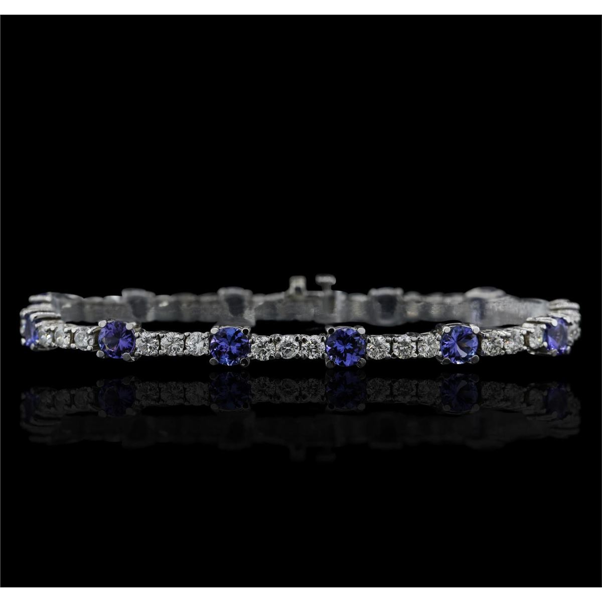 One electronically tested 14KT white gold ladies combination cast & assembled tennis bracelet with a hidden box clasp with a bright polish finish. Condition is new. Measurements: 7" in length. Identified with markings of "14K". Containing: Twelve prong set round modified brilliant cut natural tanzanites, measuring 5.00 - 5.00 x 3.25 mm, approximate total weight of 6.48ct., clarity is eye clean, type I, medium light, moderately strong, bluish violet color, (GIA bV 4/4), cut is very good. Thirty-Eight prong set round brilliant cut diamonds, measuring 3.00 - 3.00 x 1.80mm (depth est.) approximate total weight of 38 Stones = 3.75ct. Clarity: SI-1 to I-1. Color: H - J, Cut is Good. Colored gemstones are presumed to have been subjected to commonly used enhancement processes. All diamonds and colored gemstones are graded in the mounting, unless otherwise stated. Total Weight of Colored Stones 6.48ct. Total Weight of Diamonds 3.75ct. Total Weight of Bracelet 15.40 grams. GGL Appraised at $14,310.00.
