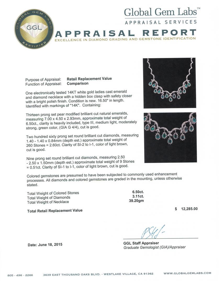 One electronically tested 14KT white gold ladies cast emerald and diamond necklace with a hidden box clasp with safety closer with a bright polish finish. 16.50" in length. Identified with markings of "14K". Condition is new. Containing: Thirteen prong set pear modified brilliant cut natural emeralds, measuring 7.00 x 4.50 x 2.93mm, approximate total weight of 6.50ct., clarity is heavily included, type III, medium light, moderately strong, green color, (GIA G 4/4), cut is good. Two Hundred Sixty prong set round brilliant cut diamonds, measuring 1.40 - 1.40 x 0.84mm (depth est.) approximate total weight of 260 Stones = 2.60ct. Clarity: SI-2 to I-1, Cut is Good. Nine prong set round brilliant cut diamonds, measuring 2.50 - 2.50 x 1.50mm (depth est.) approximate total weight of 9 Stones = 0.51ct. Clarity: SI-1 to I-1, Cut is Good. Colored gemstones are presumed to have been subjected to commonly used enhancement processes. All diamonds and colored gemstones are graded in the mounting, unless otherwise stated. Total Weight of Colored Stones 6.50ct. Total Weight of Diamonds 3.11ct. Total Weight of Necklace 39.20 grams. GGL Appraised at $12,285.00.
