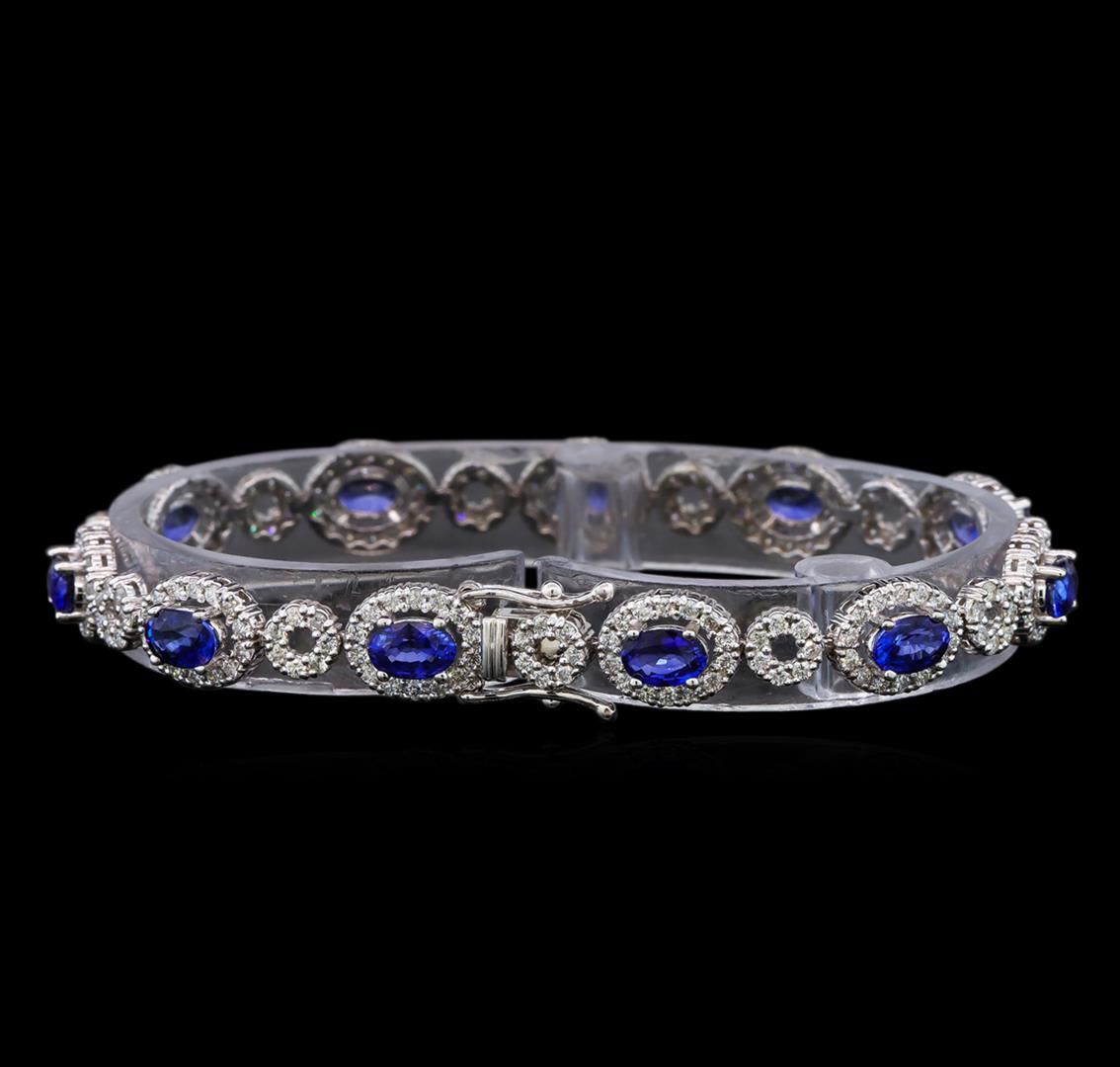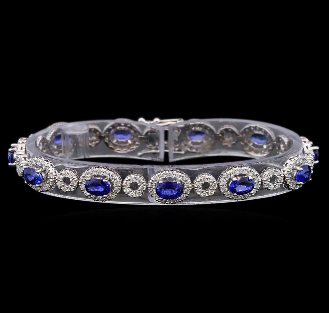 One electronically tested 14KT white gold ladies cast blue sapphire and diamond bracelet with a hidden box clasp with safety closer with a bright polish finish. Measurements: 6.75" in length Identified with markings of "585". Condition is new. Containing: Eleven prong set oval modified brilliant cut natural blue sapphires, measuring 5.90 x 4.00 x 2.60mm, approximate total weight of 6.50ct., clarity is eye clean, type II, medium, moderately strong, blue color, (GIA B 5/4), cut is very good. Two Hundred Thirty-One prong set round brilliant cut diamonds, measuring 1.50 - 1.50 x 0.90mm (depth est.) approximate total weight of 231 Stones = 2.65ct. Clarity: SI-1 to SI-2. Color: I - J, Cut is Good. Colored gemstones are presumed to have been subjected to commonly used enhancement processes. All diamonds and colored gemstones are graded in the mounting, unless otherwise stated. Total Weight of Colored Stones 6.50ct. Total Weight of Diamonds 2.65ct. Total Weight of Bracelet 13.40 grams. GGL Appraised at $8,940.00.