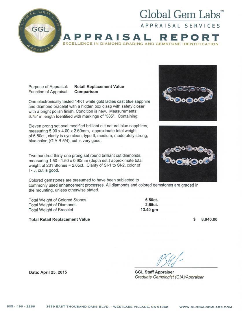 One electronically tested 14KT white gold ladies cast blue sapphire and diamond bracelet with a hidden box clasp with safety closer with a bright polish finish. Measurements: 6.75" in length Identified with markings of "585". Condition is new. Containing: Eleven prong set oval modified brilliant cut natural blue sapphires, measuring 5.90 x 4.00 x 2.60mm, approximate total weight of 6.50ct., clarity is eye clean, type II, medium, moderately strong, blue color, (GIA B 5/4), cut is very good. Two Hundred Thirty-One prong set round brilliant cut diamonds, measuring 1.50 - 1.50 x 0.90mm (depth est.) approximate total weight of 231 Stones = 2.65ct. Clarity: SI-1 to SI-2. Color: I - J, Cut is Good. Colored gemstones are presumed to have been subjected to commonly used enhancement processes. All diamonds and colored gemstones are graded in the mounting, unless otherwise stated. Total Weight of Colored Stones 6.50ct. Total Weight of Diamonds 2.65ct. Total Weight of Bracelet 13.40 grams. GGL Appraised at $8,940.00.