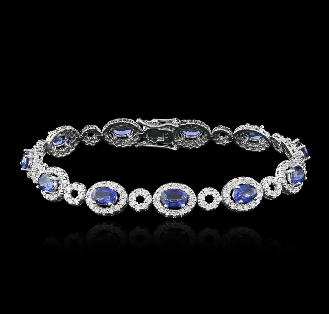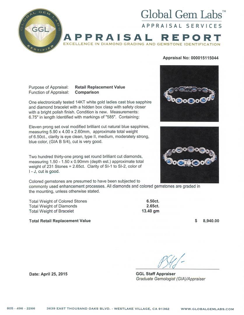 One electronically tested 14KT white gold ladies cast blue sapphire and diamond bracelet with a hidden box clasp with safety closer with a bright polish finish. Measurements: 6.75" in length Identified with markings of "585". Condition is new. Containing: Eleven prong set oval modified brilliant cut natural blue sapphires, measuring 5.90 x 4.00 x 2.60mm, approximate total weight of 6.50ct., clarity is eye clean, type II, medium, moderately strong, blue color, (GIA B 5/4), cut is very good. Two Hundred Thirty-One prong set round brilliant cut diamonds, measuring 1.50 - 1.50 x 0.90mm (depth est.) approximate total weight of 231 Stones = 2.65ct. Clarity: SI-1 to SI-2. Color: I - J, Cut is Good. Colored gemstones are presumed to have been subjected to commonly used enhancement processes. All diamonds and colored gemstones are graded in the mounting, unless otherwise stated. Total Weight of Colored Stones 6.50ct. Total Weight of Diamonds 2.65ct. Total Weight of Bracelet 13.40 grams. GGL Appraised at $8,940.00.
