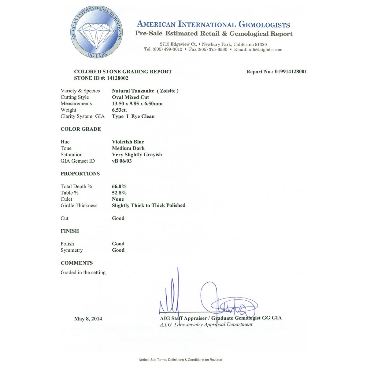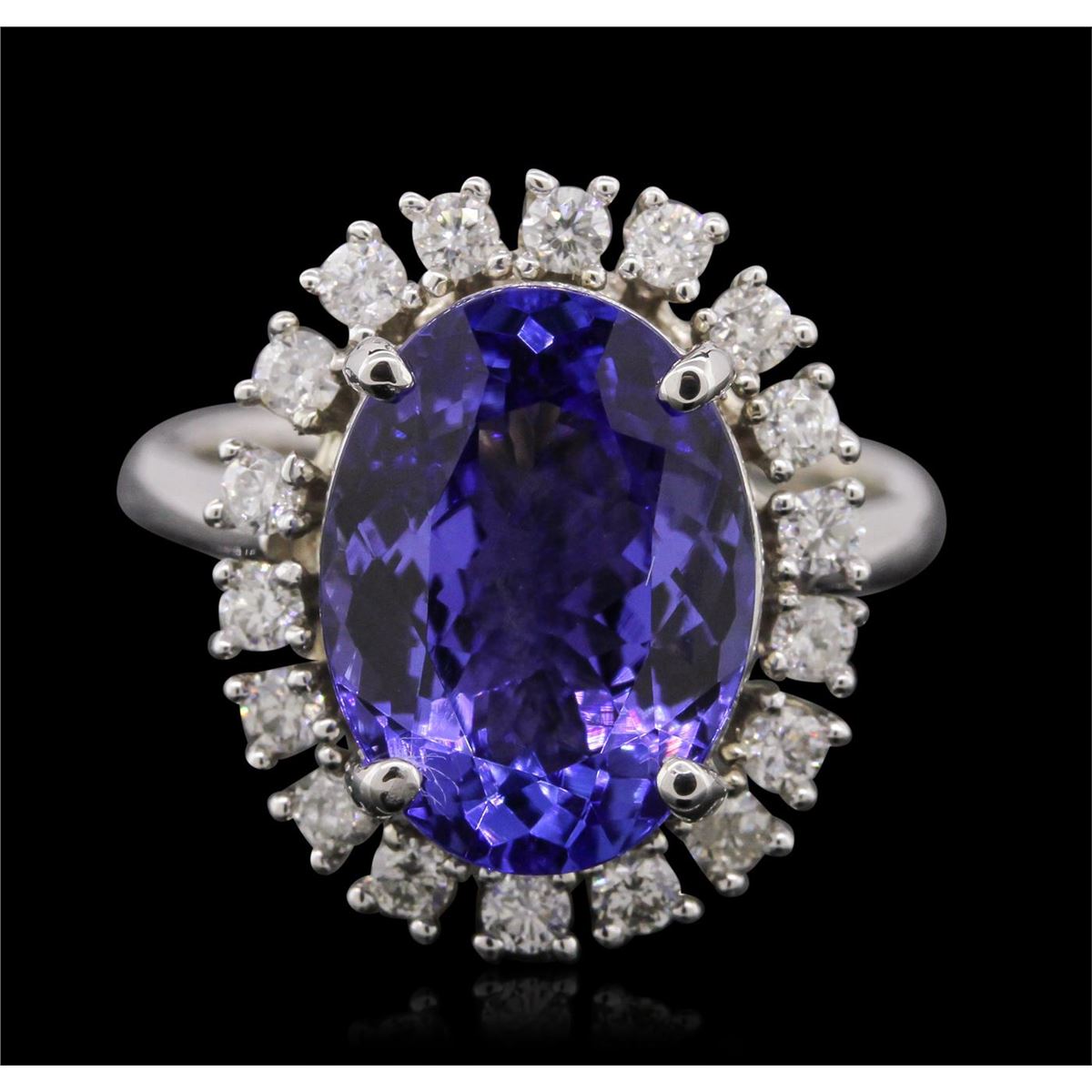 One electronically tested 14KT white gold ladies cast tanzanite and diamond ring with a bright polish finish. Condition is new, good workmanship. The featured tanzanite is set within a diamond bezel supported by tapering shoulders, completed by a three millimeter wide band. Identified with markings of "K14". Containing: One prong set oval mixed cut natural tanzanite, measuring 13.50 x 9.85 x 6.50mm, 10%. bulge factor, approximate weight of 6.53ct., clarity is eye clean, type I, medium dark, very slightly grayish, violetish blue color, (GIA vB 6/3), cut is good. Transmitting light with no distortion, transparent. Colored Stone Grading Report attached. Graded in the setting. Tanzanite is a very rare gemstone that is only found in the country of Tanzania. Originally discovered in 1967. Tiffany & Company, named the stone Tanzanite. It is found in the Usumburu Mountains that border the Umba Valley of northern Tanzania. Tanzanite occurs in gray, brown, violet, blue, reddish-purple, & green. The gem is interesting because of its exceptional pleochroism. Rotated in different directions a tanzanite will exhibit multiple changes of color. Tanzanite has a low tolerance to ultrasonic cleaning, and should not be cleaned using this method. Eighteen prong set round brilliant cut diamonds, measuring 2.00 - 2.00 x 1.20mm (depth est.) approximate. Total Weight of 18 Stones = 0.62ct. Graded in the setting. Clarity: SI-1 to I-1. Color: G - I. Total Weight of Colored Stones 6.53ct. Total Weight of Diamonds 0.62ct. Total Weight of Ring 8.00gm. AIG Appraised at $19,510.00.
