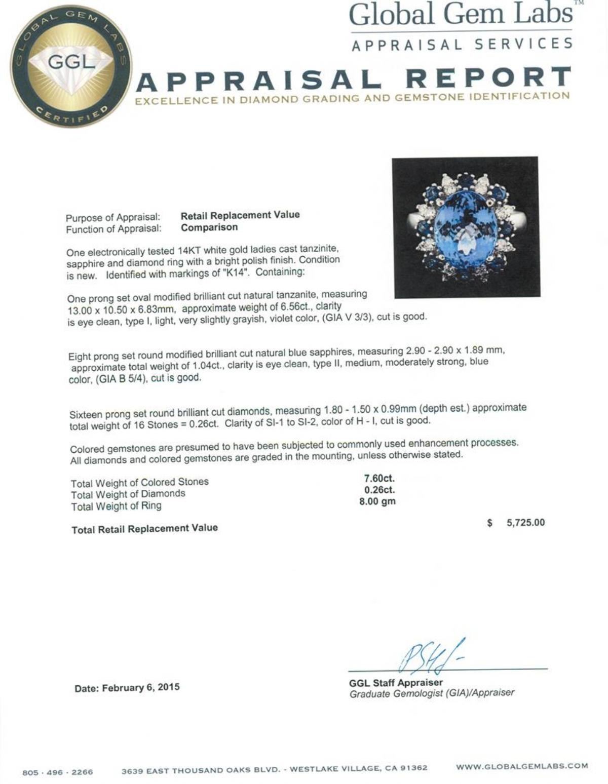 One electronically tested 14KT white gold ladies cast tanzanite, sapphire and diamond ring with a bright polish finish. Identified with markings of "K14". Condition is new. Containing: One prong set oval modified brilliant cut natural tanzanite, measuring 13.00 x 10.50 x 6.83mm, approximate weight of 6.56ct., clarity is eye clean, type I, light, very slightly grayish, violet color, (GIA V 3/3), cut is good. Eight prong set round modified brilliant cut natural blue sapphires, measuring 2.90 - 2.90 x 1.89 mm, approximate total weight of 1.04ct., clarity is eye clean, type II, medium, moderately strong, blue color, (GIA B 5/4), cut is good. Sixteen prong set round brilliant cut diamonds, measuring 1.80 - 1.50 x 0.99mm (depth est.) approximate total weight of 16 Stones = 0.26ct. Clarity: SI-1 to SI-2. Color: H - I, Cut is Good. Colored gemstones are presumed to have been subjected to commonly used enhancement processes. All diamonds and colored gemstones are graded in the mounting, unless otherwise stated. Total Weight of Colored Stones 7.60 ct. Total Weight of Diamonds 0.26ct. Total Weight of Ring 8.00 grams. GGL Appraised.