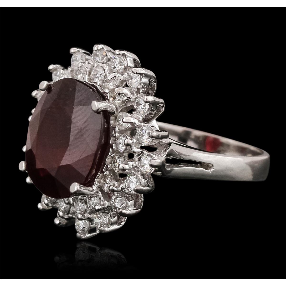 One electronically tested 14KT white gold ladies combination cast & assembled engagement ring with a bright polish finish. Identified with markings of "14K". Condition is new. Containing: One prong set oval modified brilliant cut natural ruby, measuring 12.60 x 11.20 x 7.28mm, approximate weight of 6.56ct., clarity is heavily included, type I, medium light, moderately strong, strongly purplish red color, (GIA stpR 4/4), cut is good. Forty prong set round brilliant cut diamonds, measuring 2.00 - 1.80 x 1.14mm (depth est.) approximate total weight of 40 Stones = 1.00ct. Clarity: SI-2 to I-1. Color: I - J, Cut is Good. Colored gemstones are presumed to have been subjected to commonly used enhancement processes. All diamonds and colored gemstones are graded in the mounting, unless otherwise stated. Total Weight of Colored Stones 6.56ct. Total Weight of Diamonds 1.00ct. Total Weight of Ring 8.20 grams. GGL Appraised at $6,725.00.